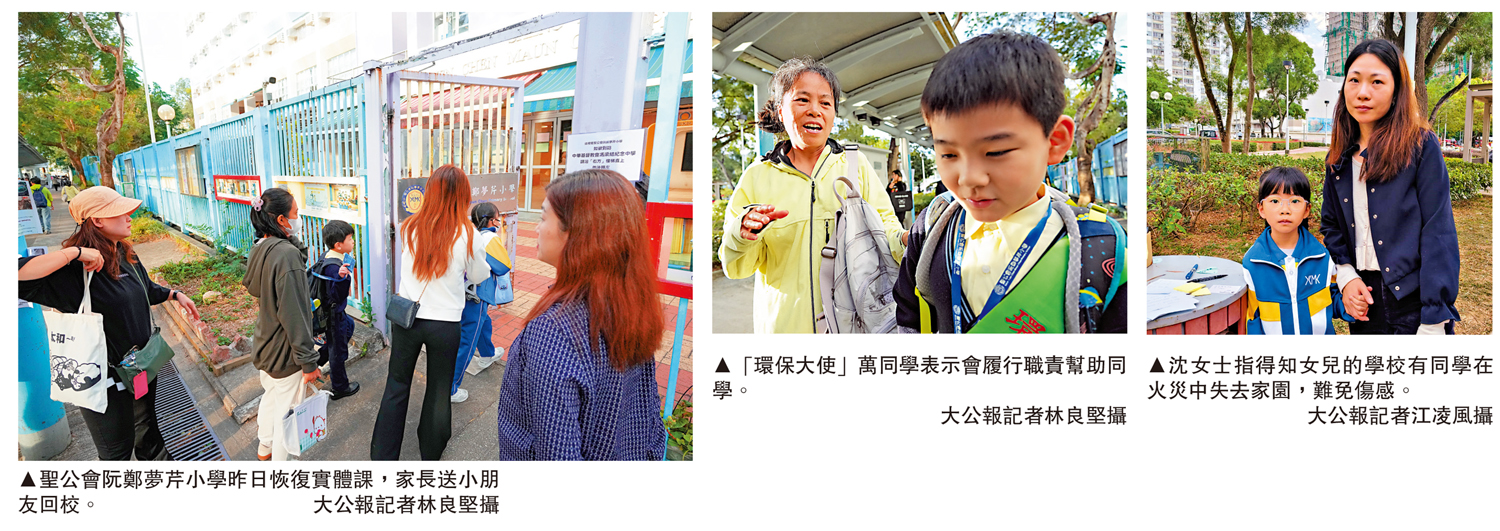 受宏福苑五級大火影響,大埔有五間學校因交通影響或被用作庇護中心而停課,本周起以不同形式復課。昨日,距離宏福苑步程五分鐘內的聖公會阮鄭夢芹小學恢復實體授課,有家長認為復課時間「有些急」。