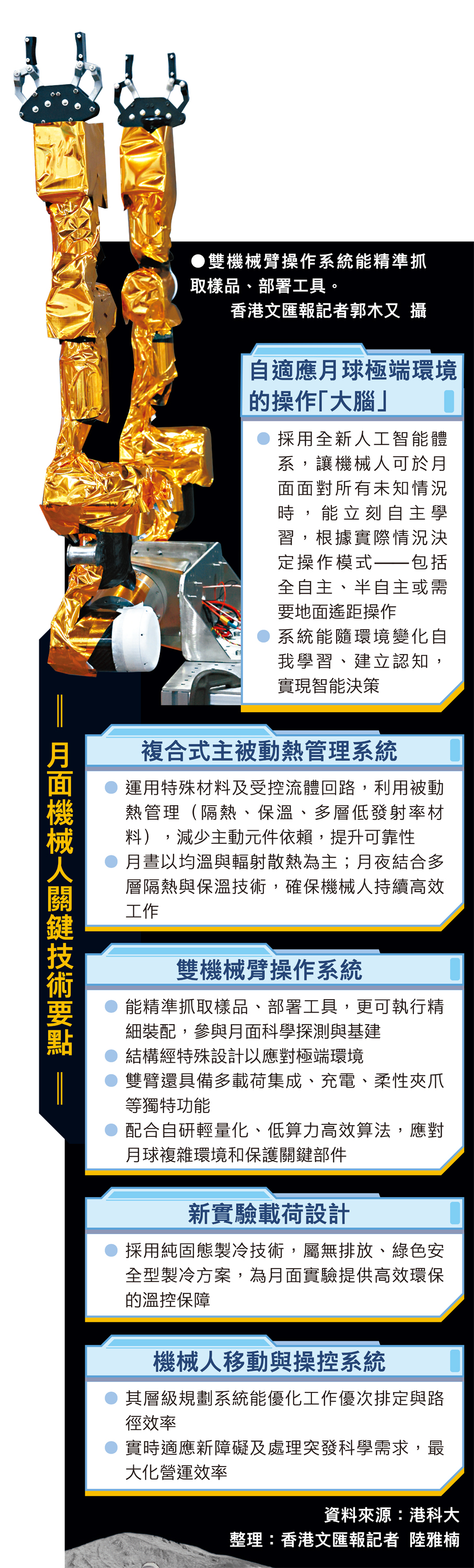 航天科技是國家戰略發展的重要支柱,香港正以優秀創科水平,為融入國家航天大局作出重要貢獻。國家計劃於2029年前後發射嫦娥八號探測器,為未來在月球表面建設國際月球科研站奠基,其中香港科技大學獲國家航天局委任,牽頭「嫦八」國際合作項目——月面多功能作業機械人暨可移動充電站,並透過特區政府InnoHK研發平台「香港太空機械人與能源中心」全力推進跨院校與跨地域合作。港科大專家團隊透露,已初步成功設計一套高度適應月球條件的機械人系統,當中分為三大主要部分,包括能以人工智能(AI)自主學習應對月面未知情況的「操作大腦」,多功能的雙機械臂操作,以及應對極端溫差的熱管理系統,確保機械人在能源效率、速度與絕對安全之間取得最佳平衡,最大程度完成科學任務。 ●香港文匯報記者 陸雅楠