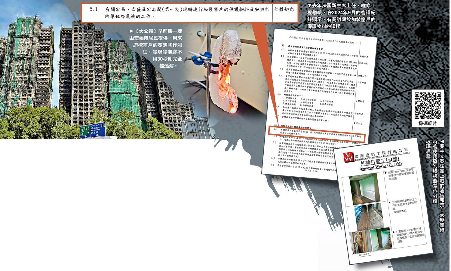 去年新上任當主席的徐滿柑沒有終止工程,促使火勢迅速蔓延的發泡膠板封窗,這樣的錯誤也沒有得到糾正。在2024年9月的會議紀錄顯示,有商討宏昌閣、宏志閣及宏盛閣關於加裝窗戶的保護物料的議程。而宏福苑業主立案法團網站,上載2024年10月2日大維修承辦商宏業建築工程的通告,稱使用發泡膠板(Form Board),完整地將單位外牆窗玻璃遮蓋作保護,以免工程期間有碎沙石擊中玻璃窗云云。