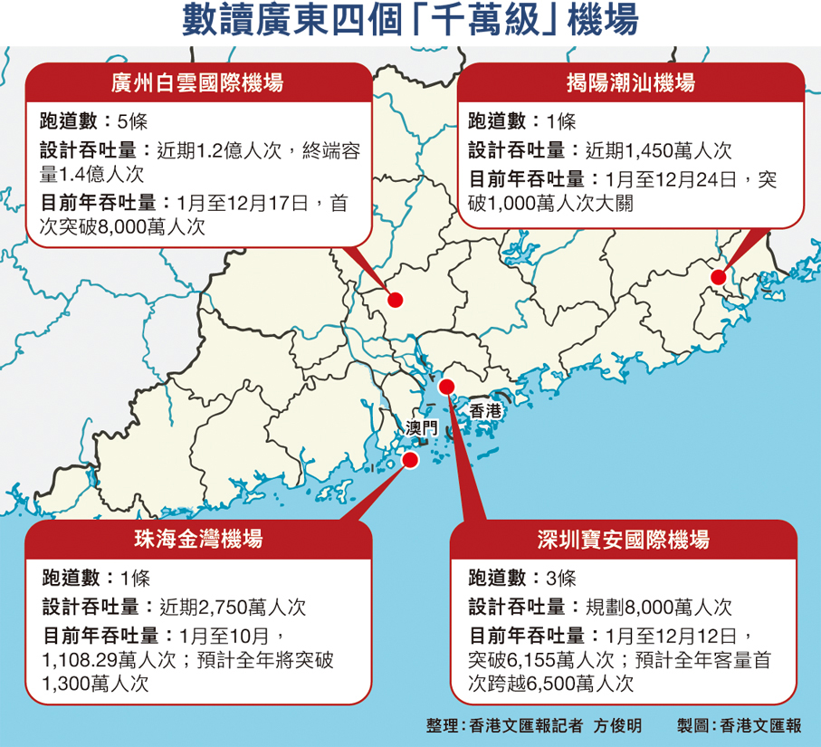 香港文匯報訊(記者 方俊明 揭陽報道)廣東第四個「千萬級」機場亮相!24日,揭陽潮汕機場年旅客吞吐量突破1,000萬人次大關,標誌着該機場正式躋身全國大型機場行列;廣東也成為全國首個擁有四個千萬級機場的省份、年旅客吞吐量持續位居全國第一。廣東機場集團指出,潮汕機場形成通達周邊省市的「2小時飛行圈」與經潮汕中轉東南亞地區的便捷航線網絡;目前已引入梅汕高鐵和在建的粵東城際鐵路,進一步融入粵東「1小時交通圈」。專家稱,以潮汕機場為區域航空支點,連同日趨完善的高鐵與城際鐵路網絡,粵東將成為連接粵港澳大灣區、海西經濟區與東南亞的 「戰略十字路口」;而潮汕機場也可攜手大灣區機場群構建區域 「空中超級通道」。