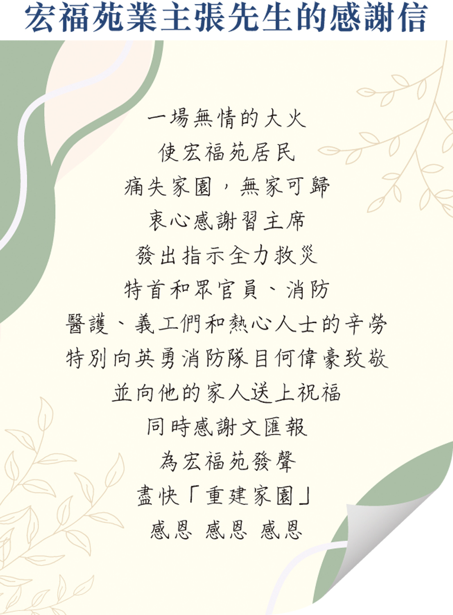 這場大火對居民的影響不盡相同,有骨肉分離之殤,有生活未知之迷茫。本來已退休的張先生或許要「重出江湖」,但這場火災也成為子女涅槃重生的契機。張先生坦言:「以前兒女可以住在家裏,上班賺錢過自己的生活,但現在他們或許要考慮通勤時間、是否要租房、未來如何獨立等等,這道坎坷或許能成為兒女成長的契機。」