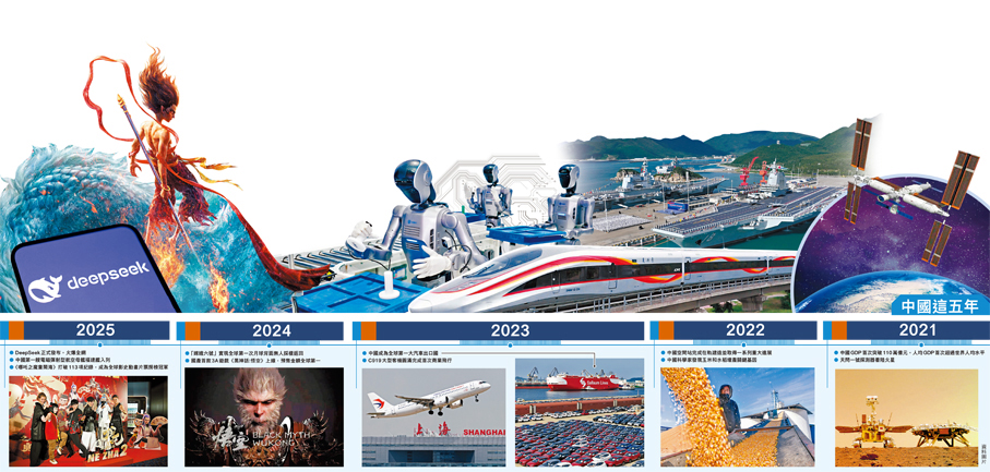 過去五年,「嫦娥」落月、「天宮」駐空、福建艦下水、DeepSeek掀智能浪潮、「哪吒」「悟空」讓世界看見東方創意……大國重器閃耀蒼穹、新興產業破繭成蝶、AI更以前所未有的深度融入日常煙火。我們每個人都是這世紀巨變的見證者、參與者及受益者。中國社會進步的成果正實打實地轉化為群眾的幸福感,中國式養老的安心、育兒補貼的暖意、醫社保網絡的全民覆蓋……每個普通人都真切觸摸到時代脈搏的強勁跳動,大國發展始終與民生福祉同頻共振。