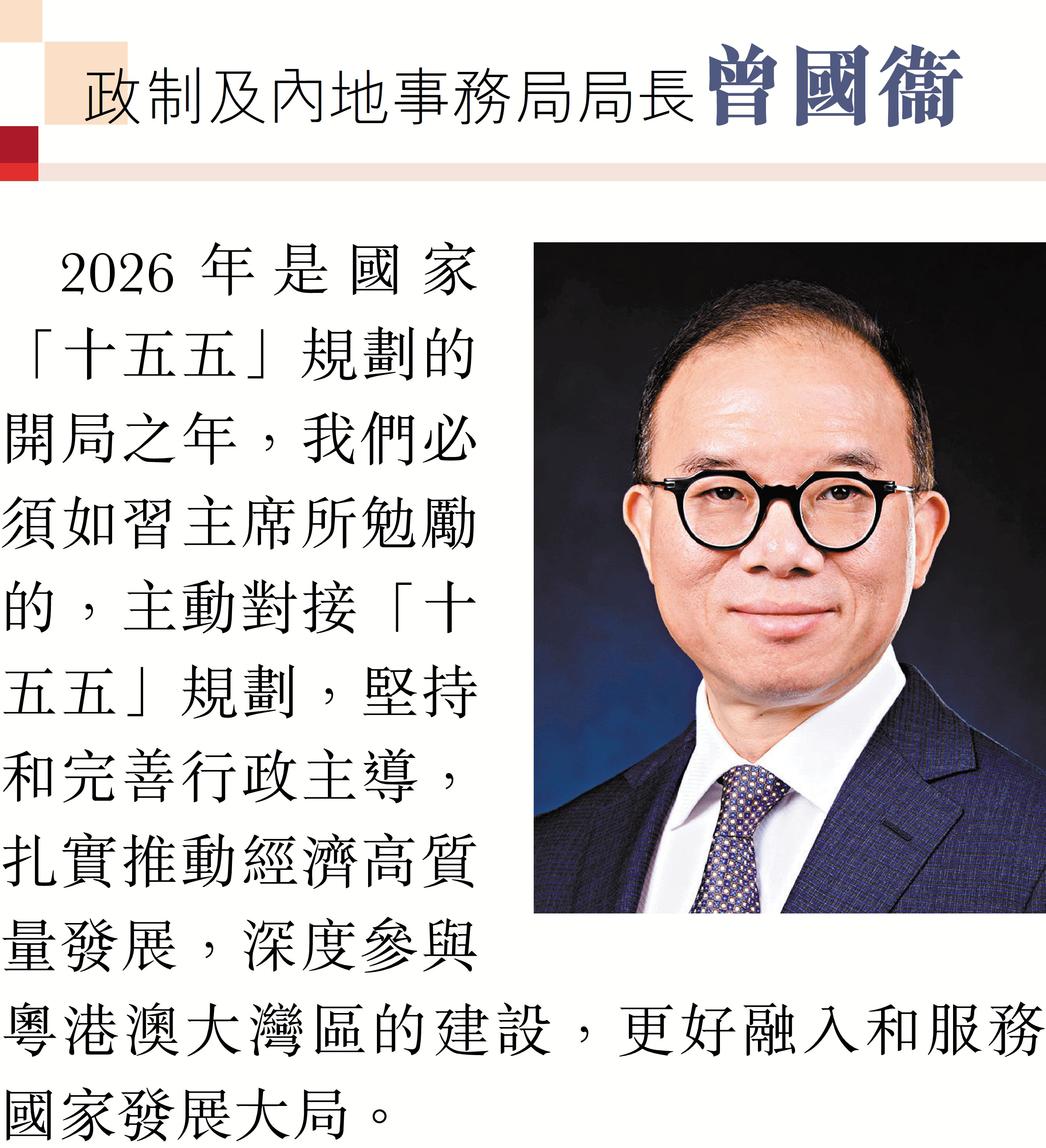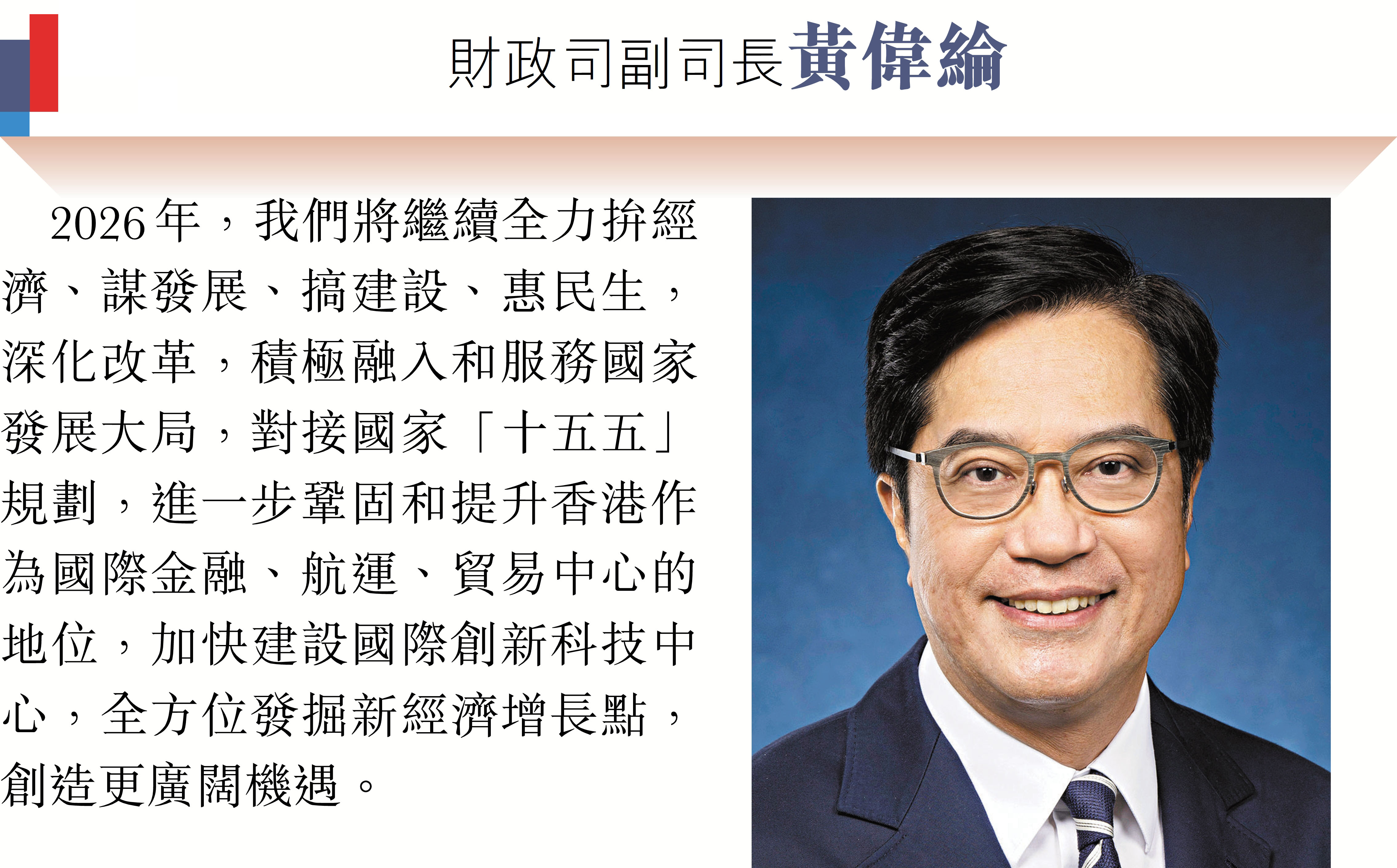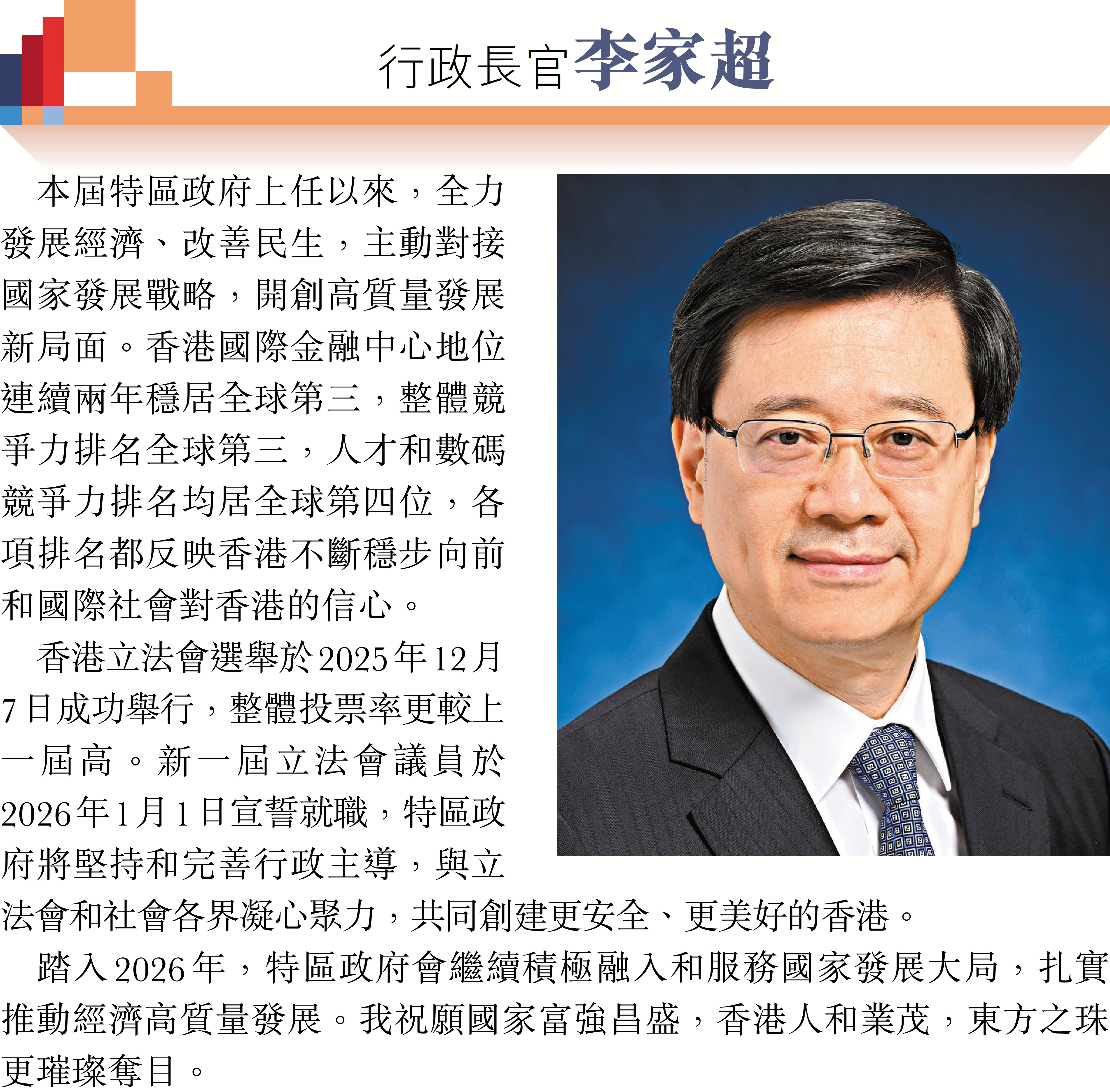 2026年元旦到來之際,香港特區行政長官李家超和特區政府司局長圍繞「同心同行、美好共創、安穩、社福同心、綠色轉型、發揮所長」等關鍵詞,向香港文匯報讀者送上誠摯的新年祝福。