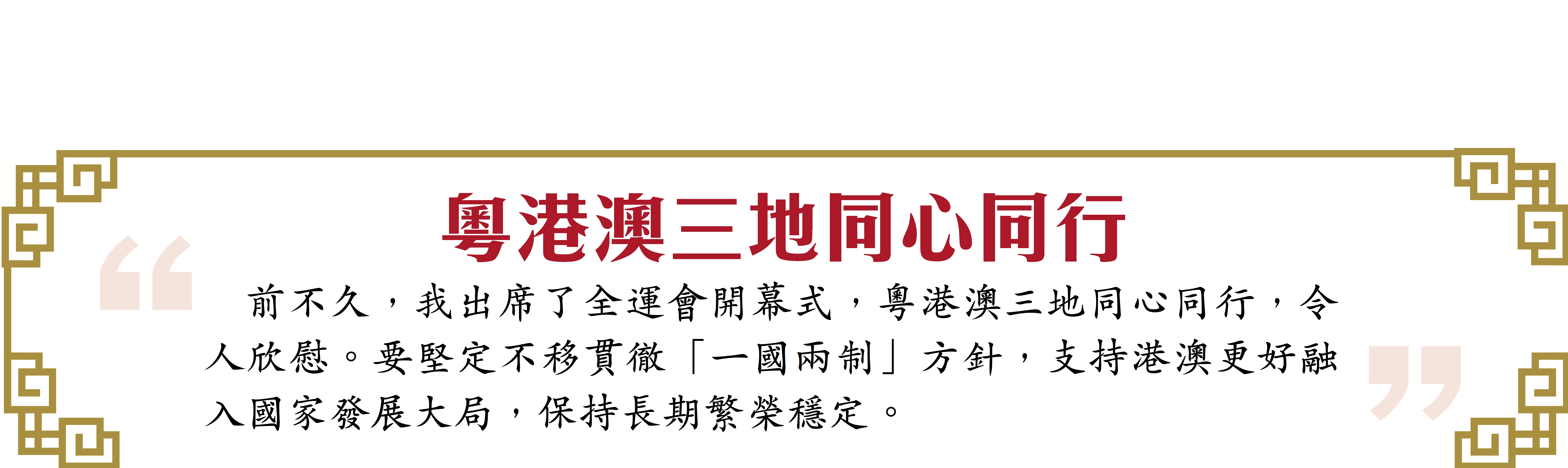 前不久,我出席了全運會開幕式,粵港澳三地同心同行,令人欣慰。要堅定不移貫徹「一國兩制」方針,支持港澳更好融入國家發展大局,保持長期繁榮穩定。兩岸同胞血濃於水,祖國統一的歷史大勢不可阻擋!