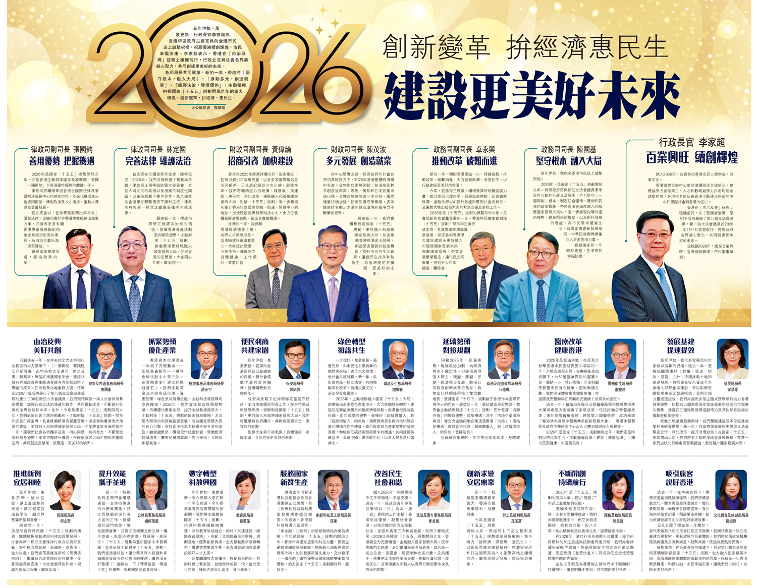 2026年是「十五五」規劃的謀篇布局之年,是實現新的高質量發展的一年。香港特區會主動對接「十五五」規劃、堅持和完善行政主導、扎實推進經濟高質量發展、深度參與粵港澳大灣區建設及更好融入和服務國家發展大局,貢獻國家發展、夯實香港繁榮穩定,讓市民安居樂業,得到更大的幸福感、獲得感!