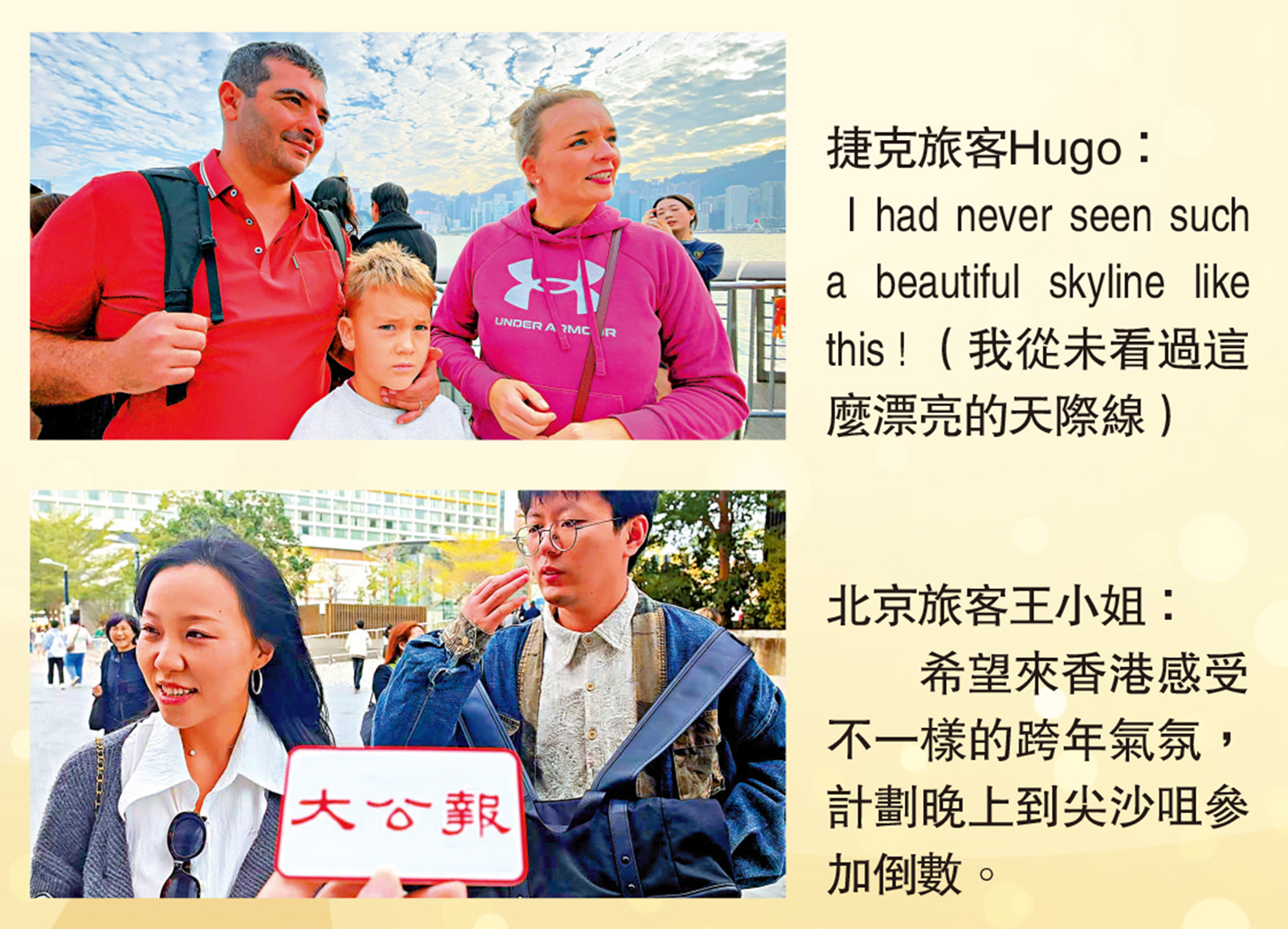 捷克旅客Hugo一家首次來港,計劃留港四天。星光大道是他們抵港後首站,Hugo指着對岸的摩天大樓,感嘆「I had never seen such a beautiful skyline like this!(我從未看過這麼漂亮的天際線)」Hugo形容,繁華是他們對香港的第一印象,認為香港跨年氛圍濃厚。
