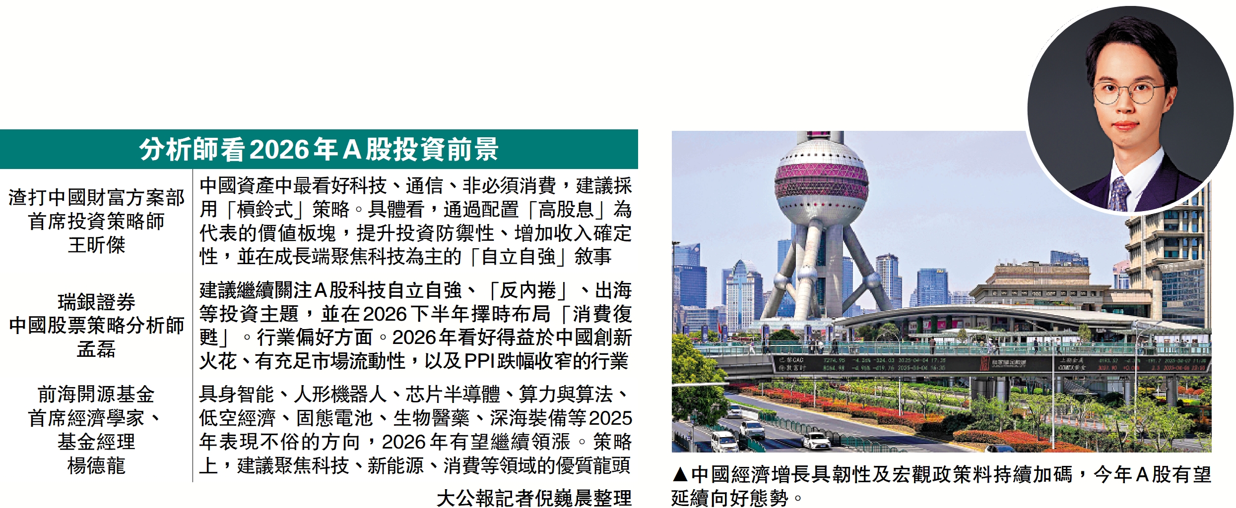 2026年投資策略方面,前海開源基金首席經濟學家楊德龍認為,「十五五」規劃建議已正式通過,其重點支持方向聚焦科技創新領域,涉及具身智能、人形機器人、芯片半導體、算力與算法、低空經濟、固態電池、生物醫藥、深海裝備等,「上述方向在2025年表現突出,2026年有望繼續領漲,並進一步深化A股牛市格局」。他相信,科技創新是中長期中國經濟轉型的核心方向,2026年A股仍將處在科技牛周期,科技主線值得高度關注。與此同時,傳統白馬股憑藉品牌價值和穩定的盈利能力,將能為股東提供持續分紅,因此同樣具備配置價值,建議聚焦科技、新能源、消費等領域的優質龍頭。