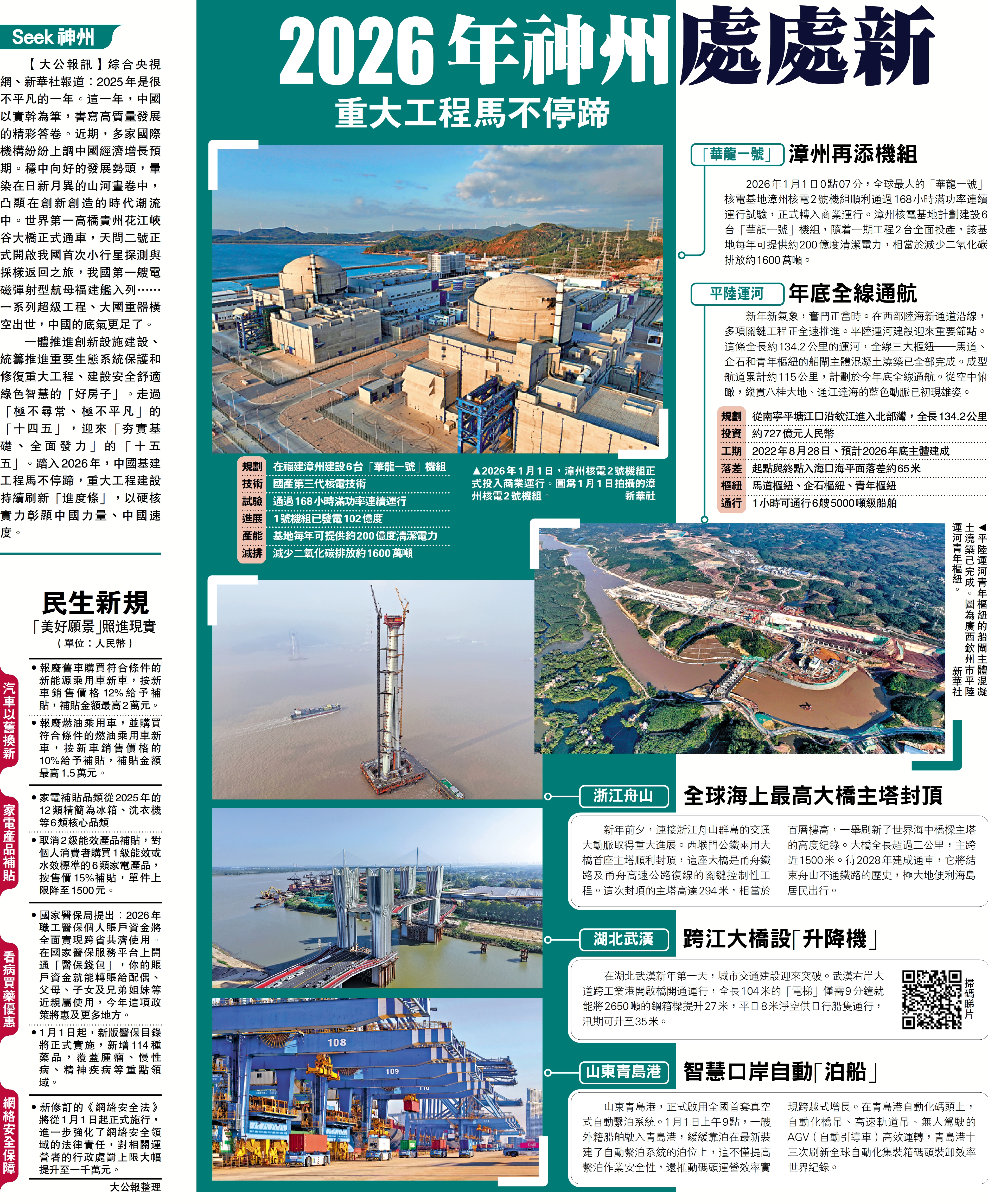 2026年1月1日0點07分,全球最大的「華龍一號」核電基地漳州核電2號機組順利通過168小時滿功率連續運行試驗,正式轉入商業運行。漳州核電基地計劃建設6台「華龍一號」機組,隨着一期工程2台全面投產,該基地每年可提供約200億度清潔電力,相當於減少二氧化碳排放約1600萬噸。