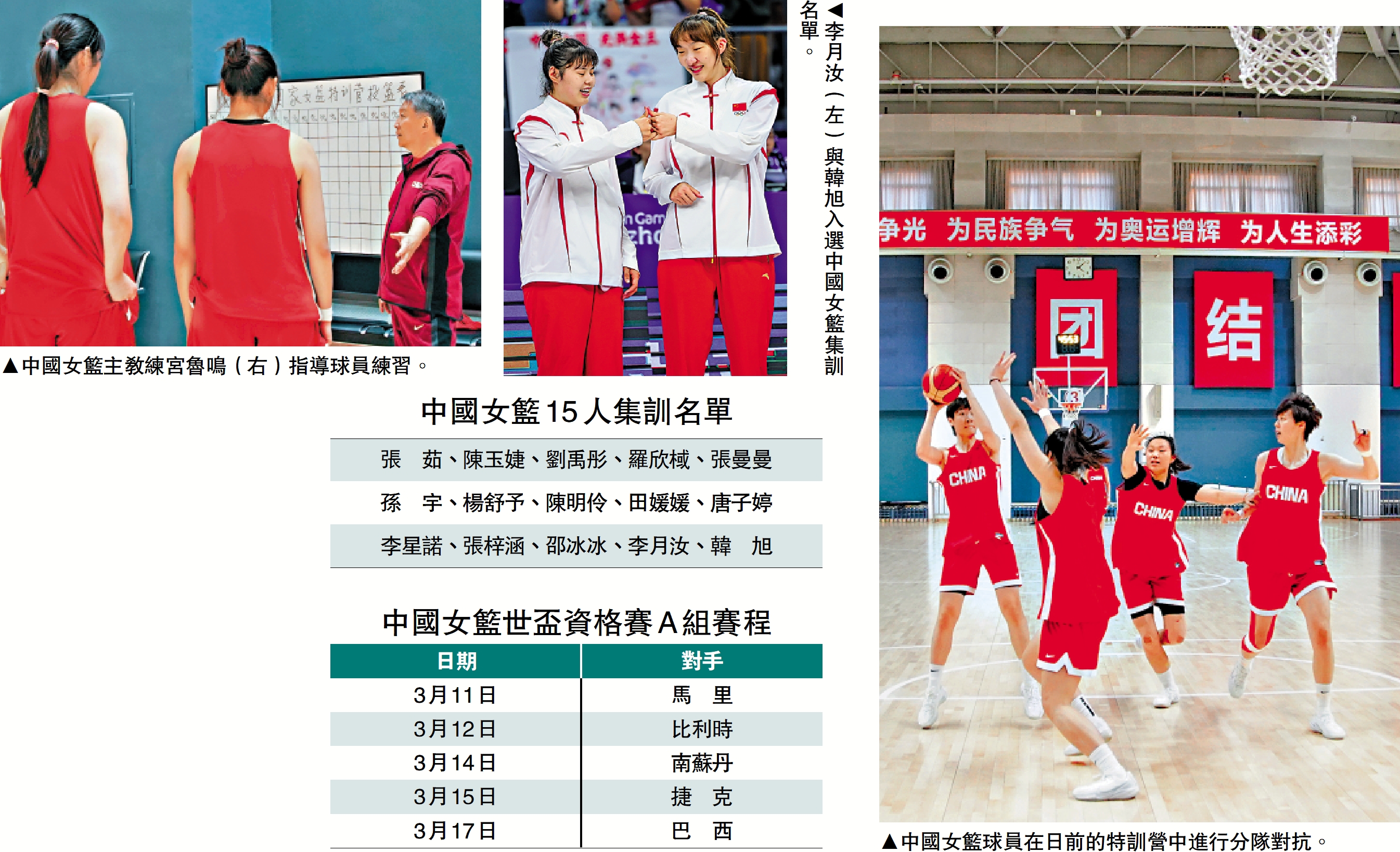 為備戰2026年國際籃聯女籃世界盃資格賽,中國籃球協會將於2026年1月4日起在北京體育大學組織國家女籃集訓選拔工作。15人集訓名單於12月31日公布,在海外聯賽效力的兩大中鋒李月汝和韓旭入選。