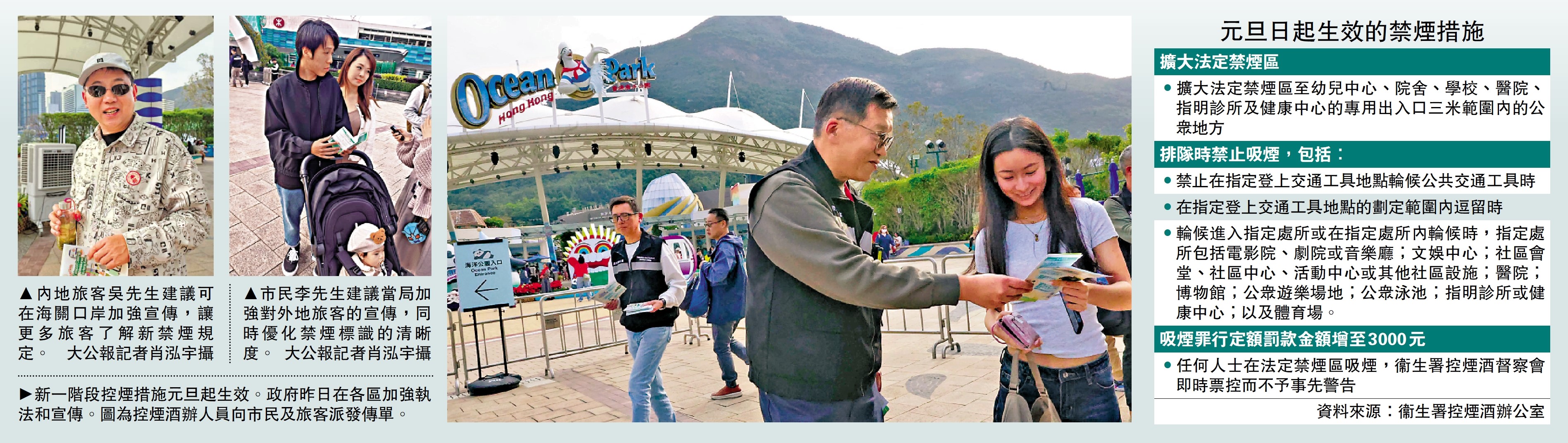 衞生署新一階段控煙措施元旦起生效,包括擴大法定禁煙區至幼兒中心、院舍、學校、醫院等專用出入口三米範圍內的公眾地方、定額罰款金額倍增至3000元等。有市民讚賞禁煙新規,認為相關措施可減少隨處吸煙的現象,保障市民健康;有旅客建議在海關口岸加強宣傳,讓更多旅客了解相關規定。