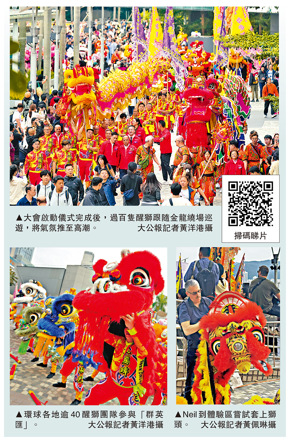 【大公報訊】記者黃佩琳報道:瑞獸喜迎新年,文化聯結東西。「2026香港龍獅節」暨第八屆「世界龍獅日」昨日在尖沙咀文化中心露天廣場開幕,並進行巡遊,今天將舉行國際醒獅比賽。巡遊有138隻醒獅及2條金龍、逾1500名運動員參加,在尖沙咀街頭上演「龍獅大匯演」,吸引大批市民和遊客駐足欣賞。有首次觀看舞獅表演的外國遊客形容演出「不可思議」,觀看巡遊後希望了解更多舞獅文化。30支來自國際及大灣區的隊伍,今日將會在尖沙咀文化中心露天廣場進行國際醒獅比賽。