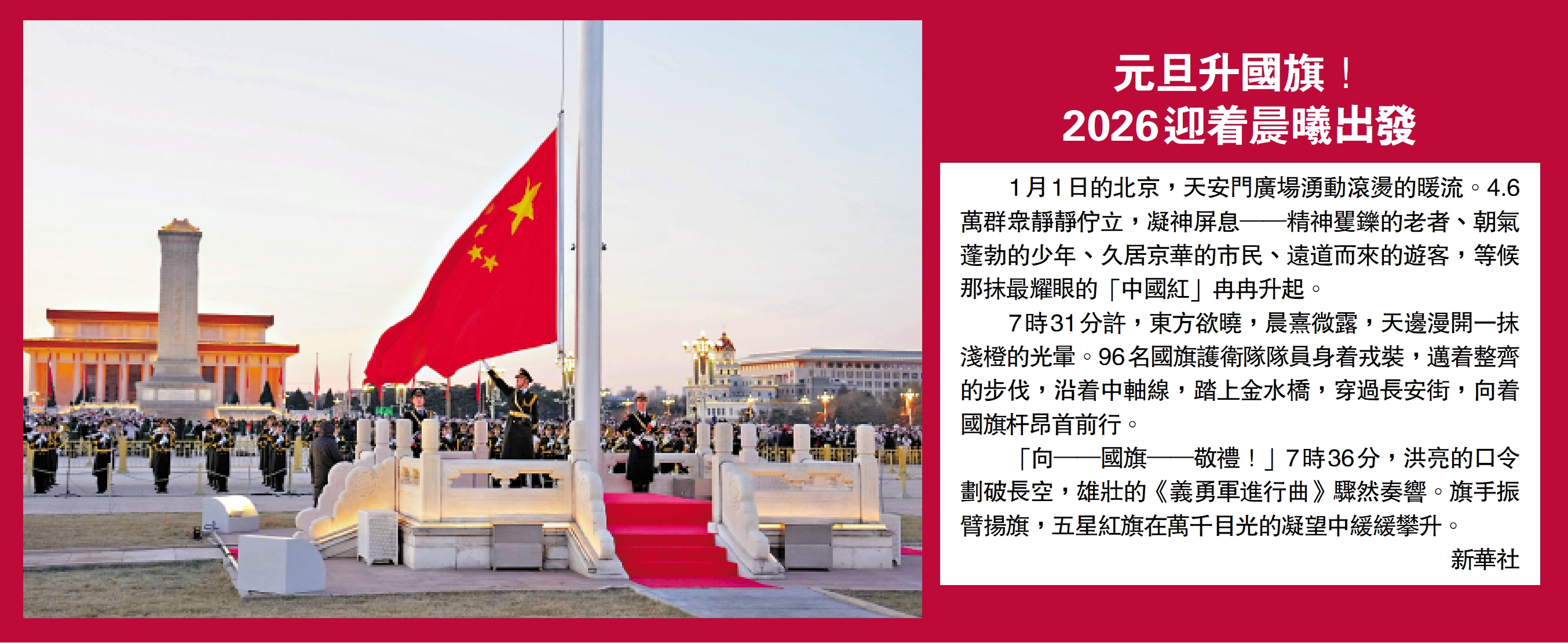1月1日的北京,天安門廣場湧動滾燙的暖流。4.6萬群眾靜靜佇立,凝神屏息──精神矍鑠的老者、朝氣蓬勃的少年、久居京華的市民、遠道而來的遊客,等候那抹最耀眼的「中國紅」冉冉升起。