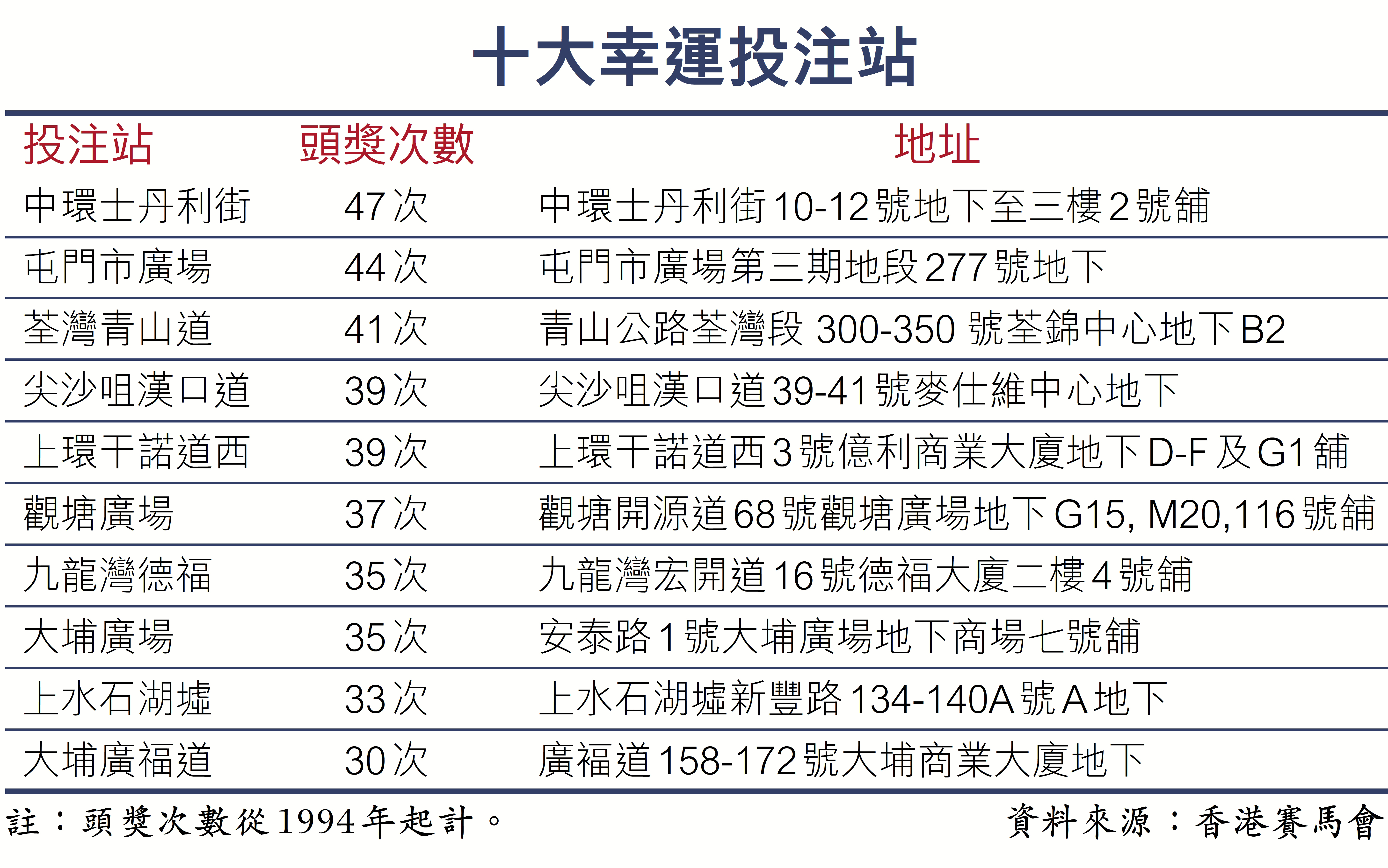 億元六合彩的截止投注時間為今晚9時15分,晚上9時30分攪珠。根據馬會統計,售出最多頭獎彩票的投注站是下列10個,其中中環士丹利街投注站由1994年至今共有47次攪出頭獎的紀錄,被譽為最幸運的投注站。