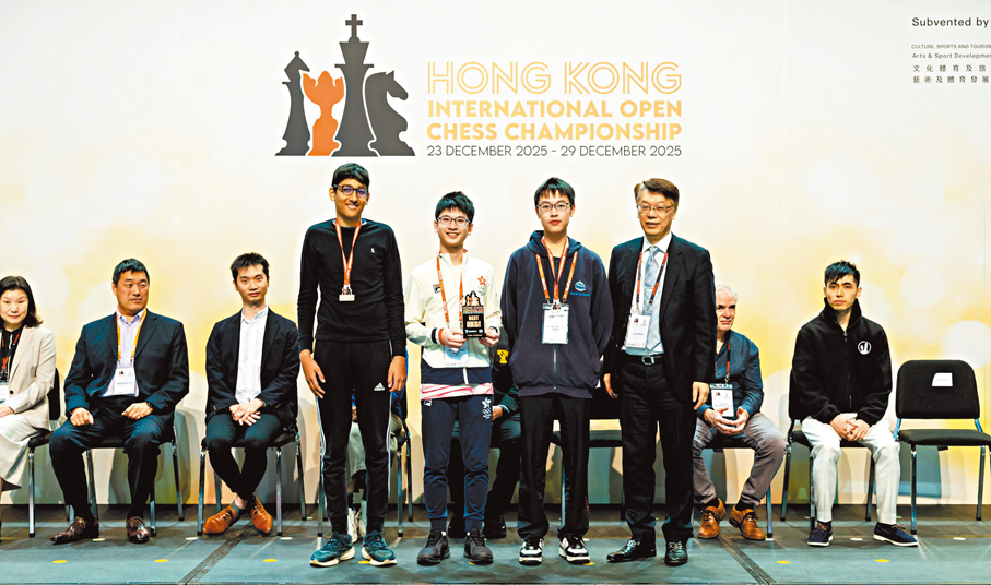 2025香港國際象棋世界公開賽日前(29日)於伊館圓滿落幕。比賽吸引約三十個地區、接近四百名選手參賽。經過一連七天的對戰,公開組冠軍最終由20歲蒙古國際大師阿馬爾圖夫辛岡卓力格奪得;挑戰組冠軍則由19歲國家女棋手鄭心爾摘下。而16歲的候選大師高家瀚(前排左二)獲得公開組的最佳香港棋手。 ●公關圖片