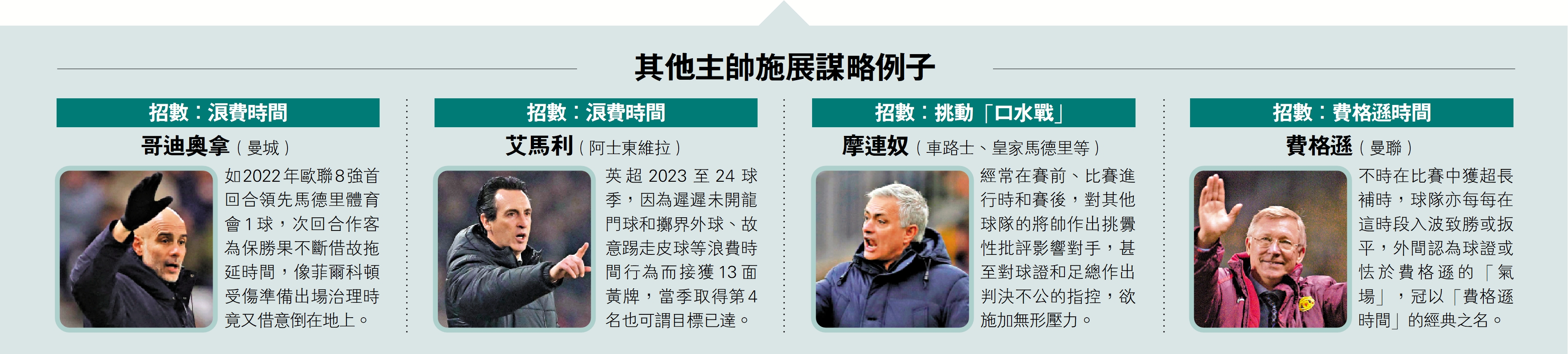 如2022年歐聯8強首回合領先馬德里體育會1球,次回合作客為保勝果不斷借故拖延時間,像菲爾科頓受傷準備出場治理時竟又借意倒在地上。
