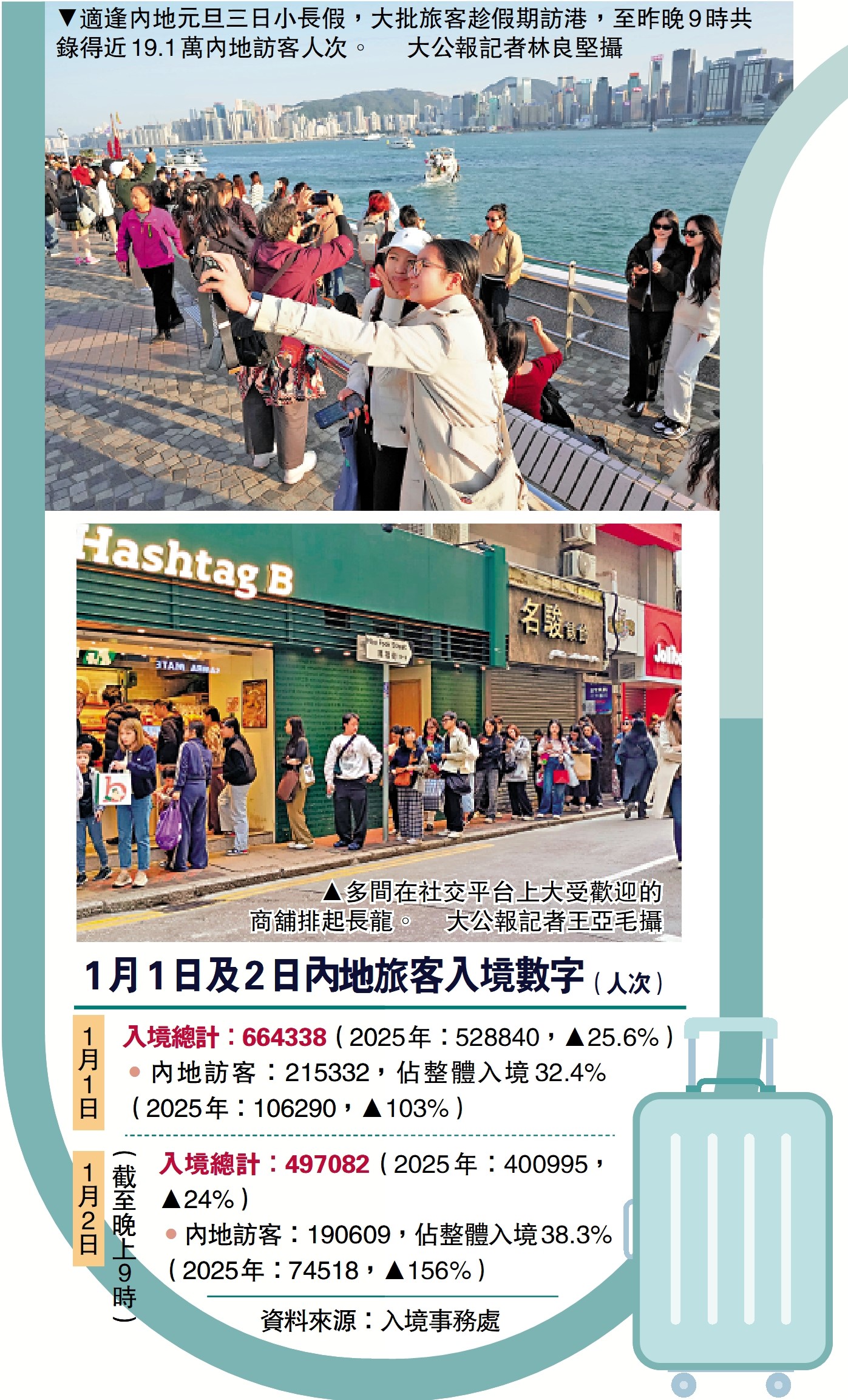 內地今年元旦有三日假期,根據入境事務處數據,首兩日共錄得40.6萬人次的內地客訪港,當中元旦日共錄得21.5萬人次內地客,較去年元旦約10.6萬內地客數目增近一倍;截至昨晚9時,昨日錄得近19.1萬人次的內地客訪港,更較去年同日的7.4萬人次大增1.5倍,佔昨日所有49.7萬入境人次的38%。