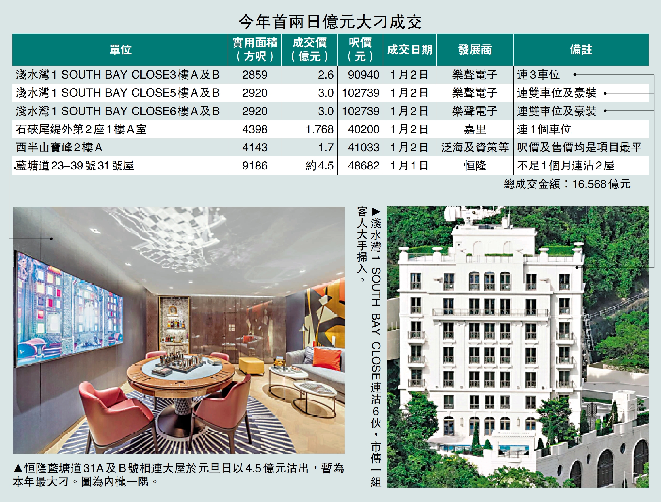 過去兩日錄得的6宗逾億元大刁,最大宗為恒隆地產(00101)旗下的跑馬地藍塘道23至39號,沽出31A及B號相連大屋,實用面積共9186方呎,成交價約4.5億元,呎價約48682元,為豪宅市場響頭炮。