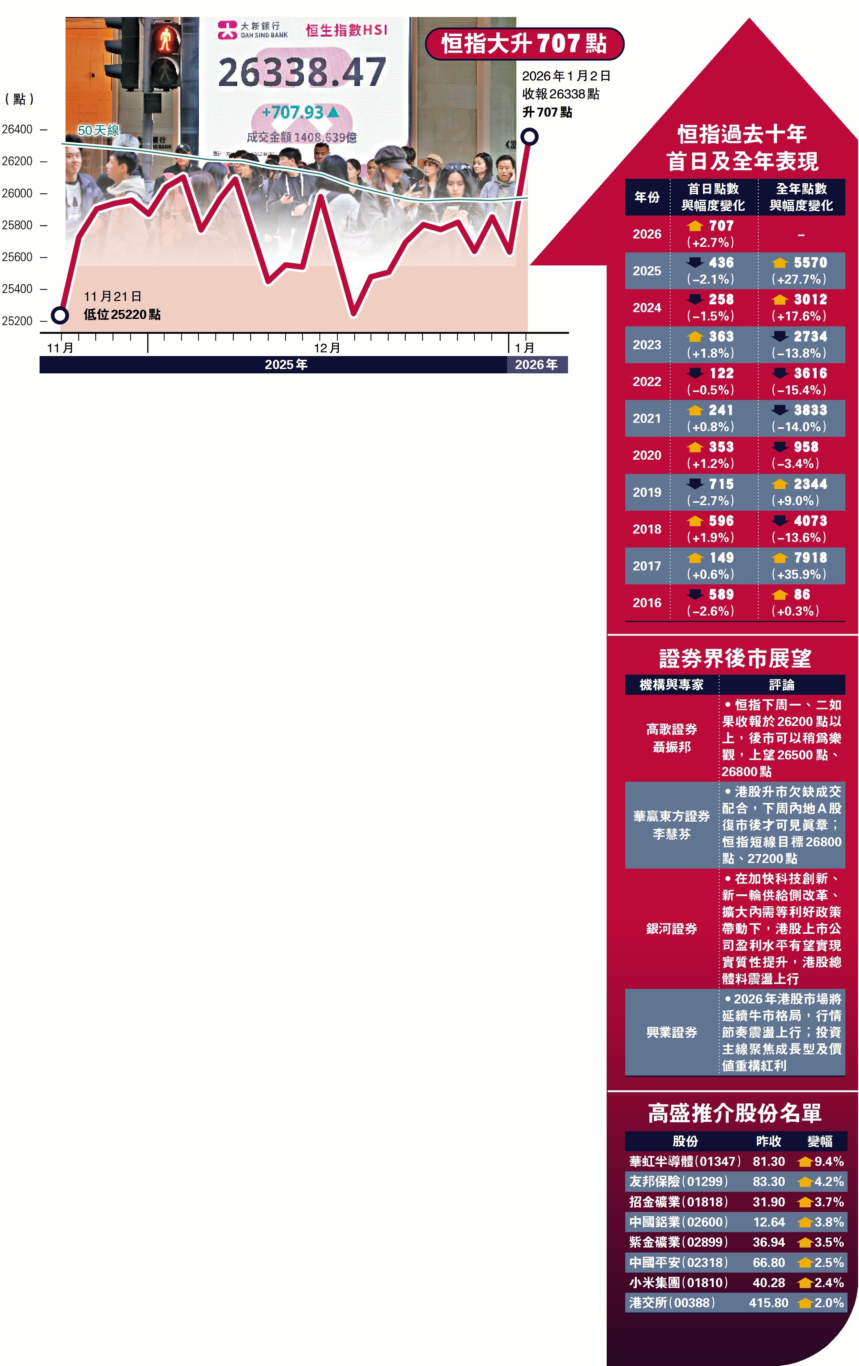 港股2026年首日紅盤高收,恒指重上二萬六關,收市升707點,是歷來表現最佳新年開盤,以2.7%升幅計,亦為13年最佳。假期前受壓的科技股成為升市火車頭。確認分拆崑崙芯上市的百度(09888)股價升9%,騰訊(00700)、阿里巴巴(09988)股價升4%。證券界人士指出,恒指表現強勢,以貼近全日高位報收,後市有機會挑戰27200點,但注意港股通下周復市,或影響港股後續走勢。另外,興業證券及銀河證券均預期港股全年將震盪上行。
