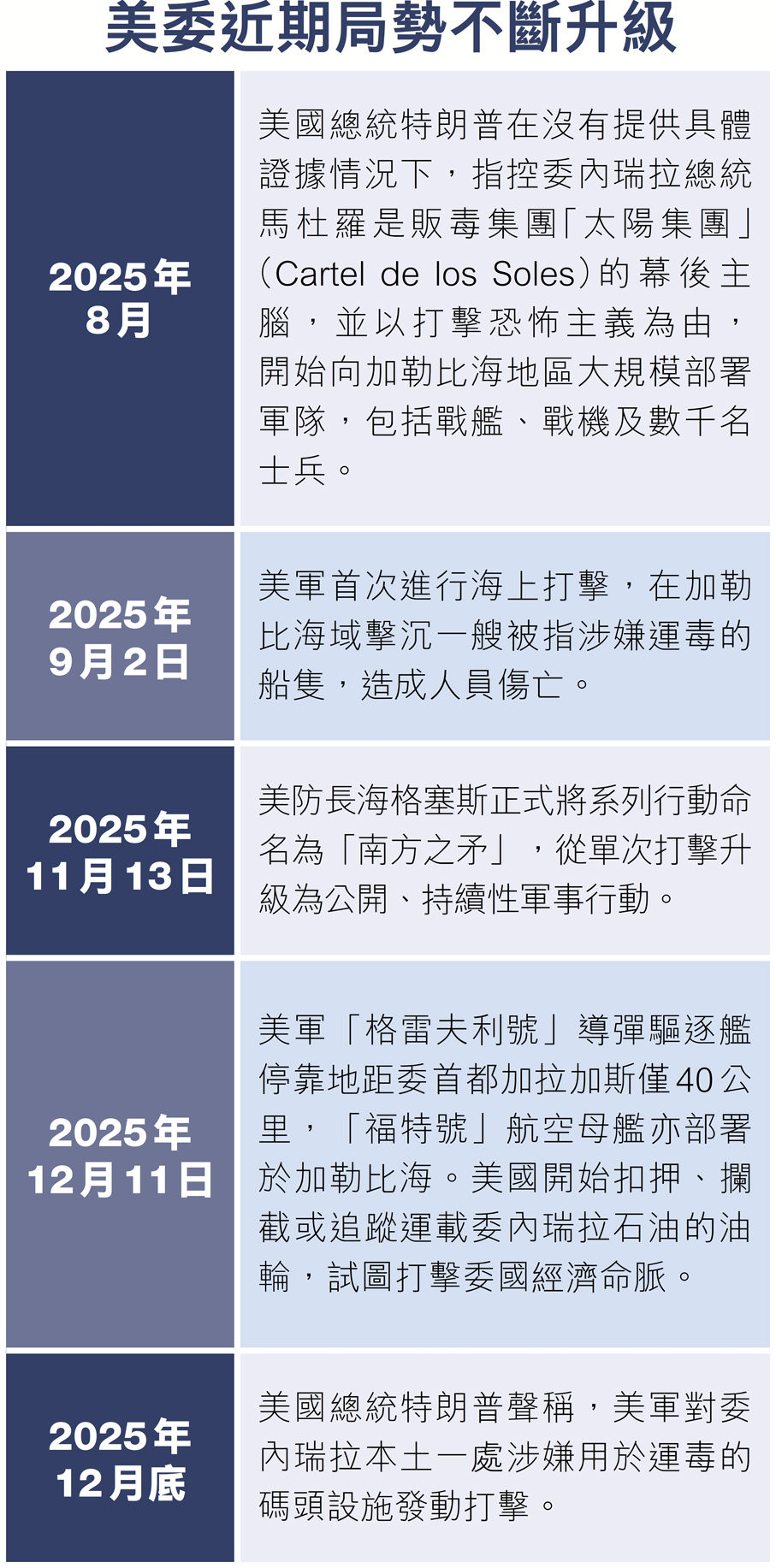 美方近期以「打擊販毒」作為對委行動的「合法性依據」,但多方指出這一理由漏洞明顯。根據美國緝毒署2024年發布的《國家毒品威脅評估報告》,委內瑞拉並非流入美國毒品的主要來源國,且在去年美方對委內瑞拉附近船隻進行一系列打擊行動後,至今尚未公布與「販毒」相關的實證。委內瑞拉全國代表大會主席羅德里格斯先前表示,美方所謂「緝毒」實為政治藉口,真實目的是控制委內瑞拉的石油資源。