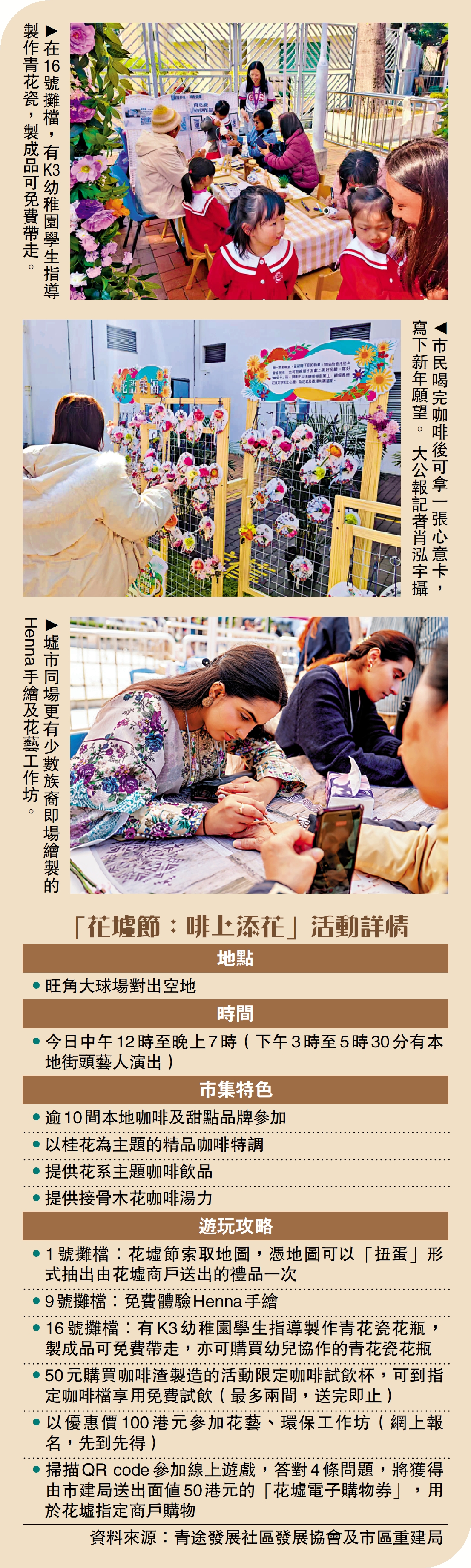 全港首個「花墟節:啡上添花」,昨日起一連兩日於旺角大球場對出空地舉行。市集結合咖啡及花藝為主題,設有15間本地咖啡、茶葉、甜點攤檔及繪畫工作坊,不少攤檔推出如桂花、玫瑰等與花相關的「限定風味」咖啡吸客。花墟各處亦有24間商戶提供購物優惠和禮品,包括換領鮮花、盆栽及種子等。