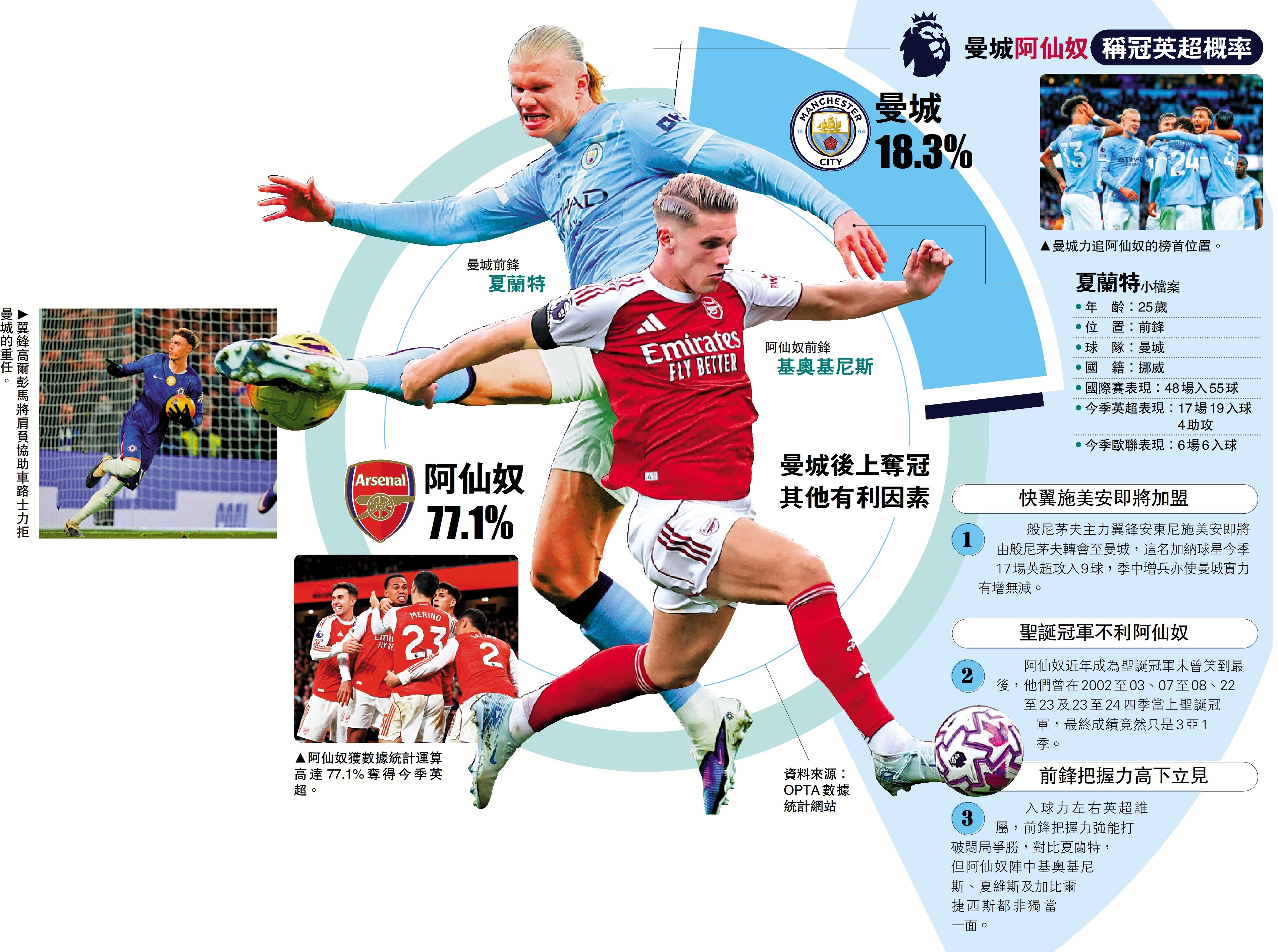 曼城於英超第19輪賽事僅賽和新特蘭後,暫排聯賽次席的他們與榜首阿仙奴積分差距擴大至4分,數據統計網站OPTA賽後運算最新奪冠概率數據顯示,阿仙奴77.1%稱冠英超,曼城卻只有18.3%,單看數字意味曼城爭冠無望。然而,翻查近季歷史,阿仙奴已數次領先下被曼城後來居上。曼城要再次後上封王,明晨主場對陣剛易帥的車路士正是搶分良機,而入球重任將落在英超入球紀錄超越C朗拿度的夏蘭特身上。\大公報記者 梁潤森