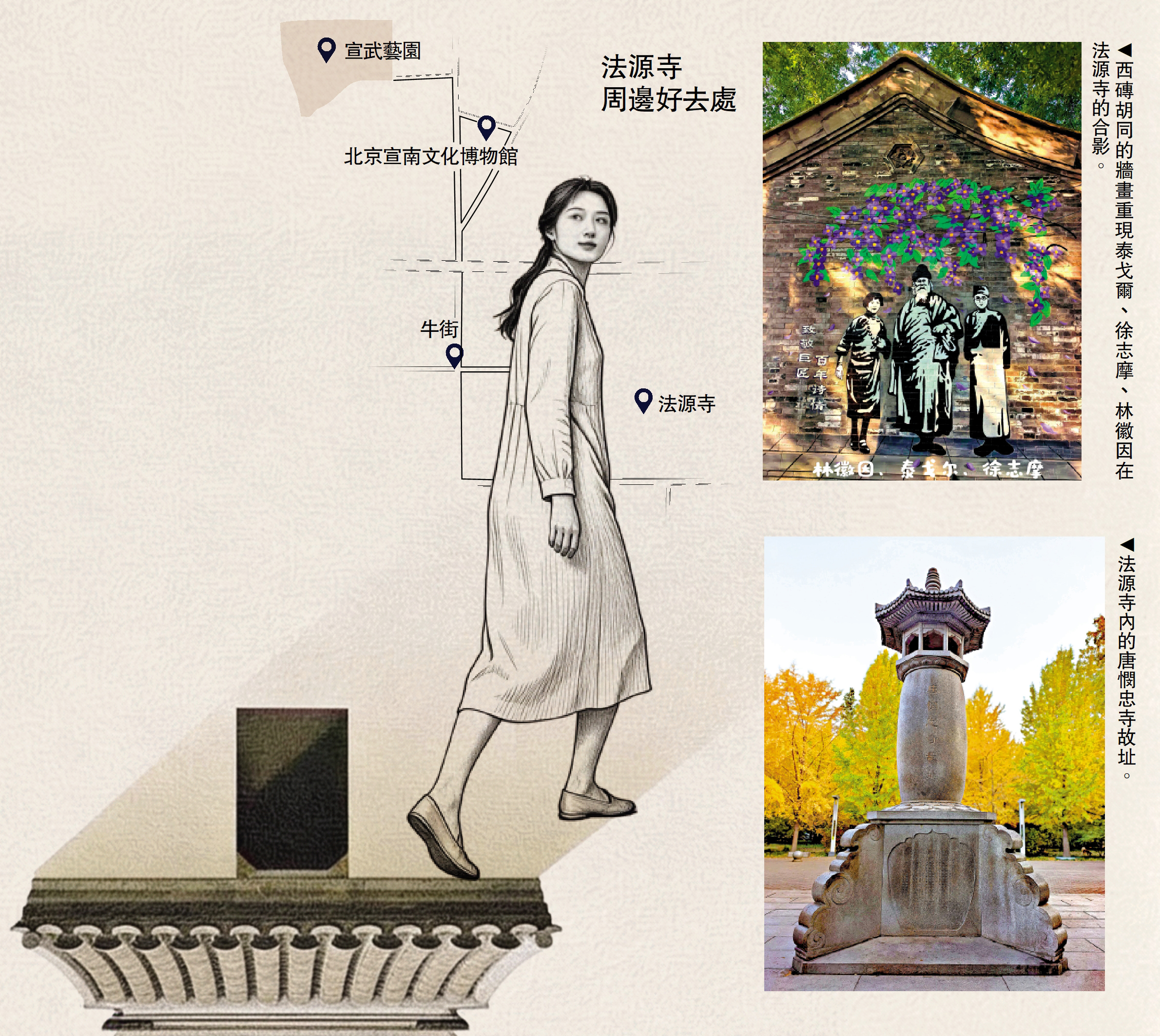 出了法源寺山門便來到西磚胡同。行不數步,一幅巨畫赫然映入眼簾:1924年暮春,諾獎獲得者泰戈爾在徐志摩、林徽因等人陪同下共赴法源寺賞花論詩,在寺內留下的那張「歲寒三友」經典合影,隨着筆墨,鮮活地重現在民居牆上。畫面裏,泰戈爾居中如蒼松,挺括着智者的堅韌;徐志摩側立似寒梅,暈染着詩人的浪漫;林徽因垂眸若修竹,氤氳着學人的清雅。三個身影,一場花事,成了中國近代文化史上動人的註腳。或許天地有情,法源有靈,寺內那株三百餘載樹齡的白皮松,竟也萌發了三枝並蒂而生的枝幹,恍若時光在此續上了未盡的緣。
