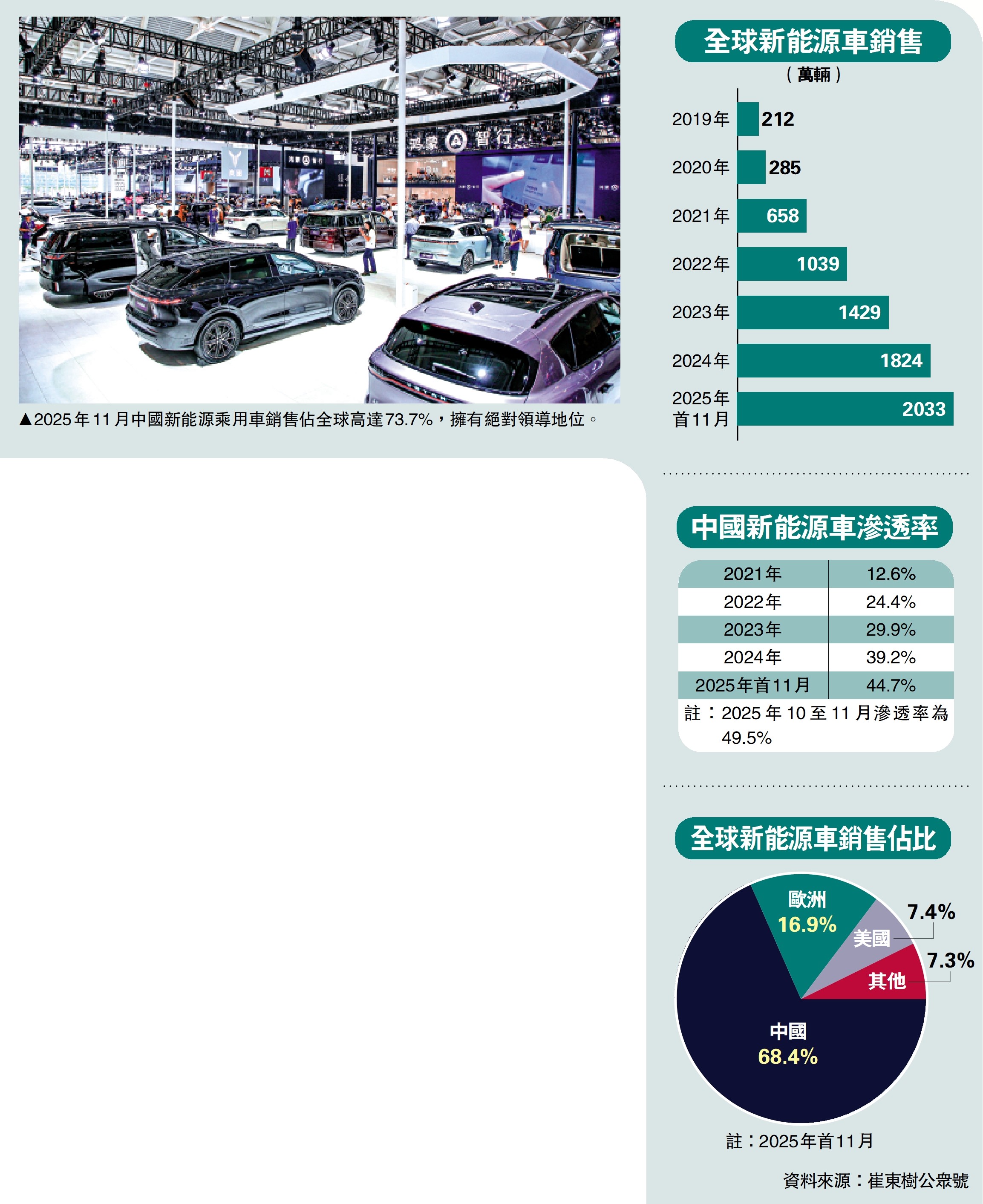 中國新能源車在全球市佔率持續高企。中國汽車流通協會乘用車市場信息聯席分會(乘聯分會)秘書長崔東樹表示,2025年首11月全球汽車銷量達8766萬輛,其中新能源車達2033萬輛,已較2024年全年增11.5%,佔比為23.2%。期內,中國新能源乘用車佔世界份額達68.4%,單計11月份更高達73.7%,可見中國新能源車在全球市場具絕對的領先地位。\大公報記者 李信