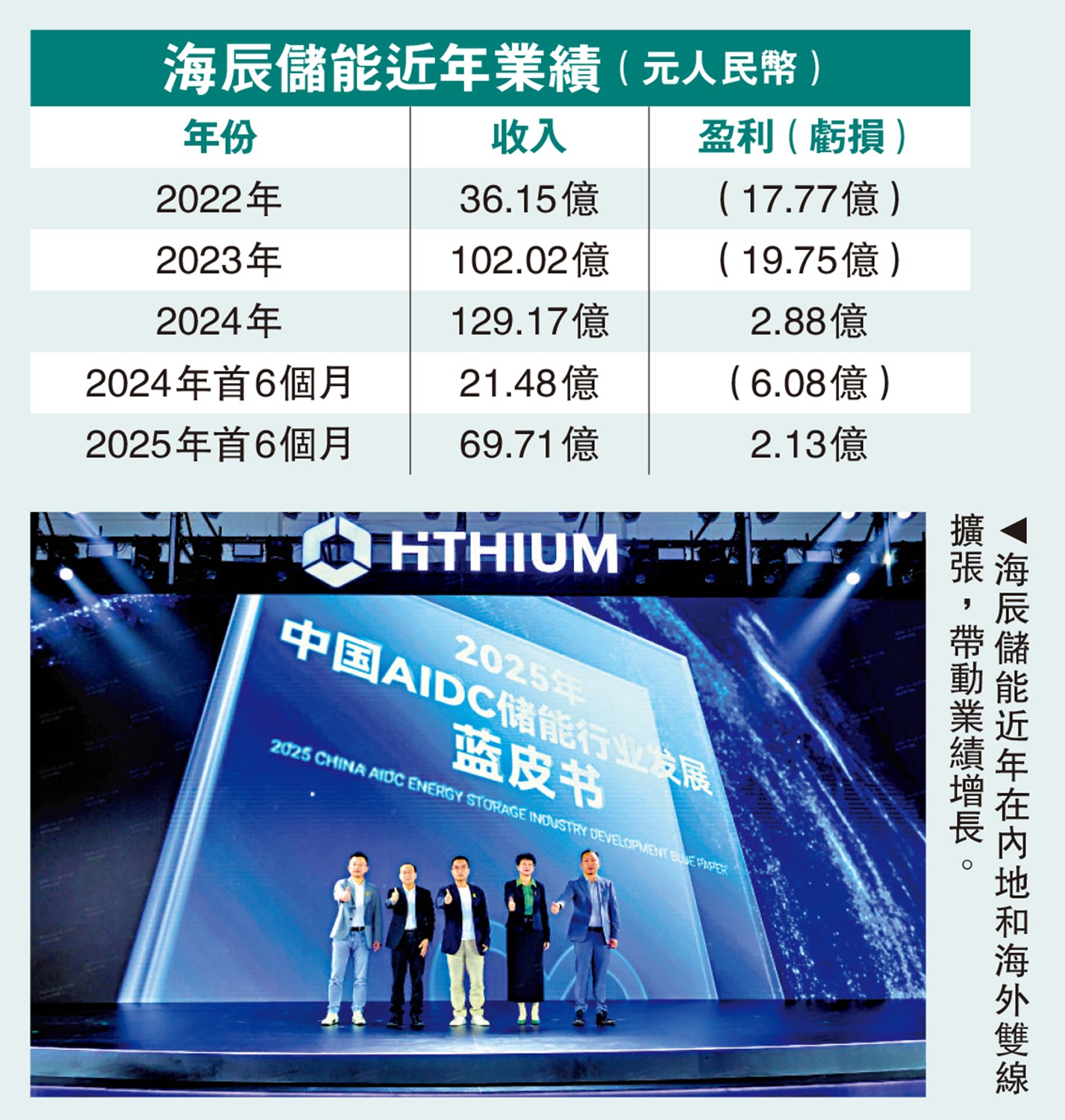 海辰儲能近年在內地和海外雙線擴張,帶動財務業績持續增長。收入由2022年的36.15億元提升至2024年的129.17億元,並於2024年扭虧賺2.88億元;2025年上半年實現收入69.71億元,按年大漲2.24倍,盈利2.13億元,按年扭虧。