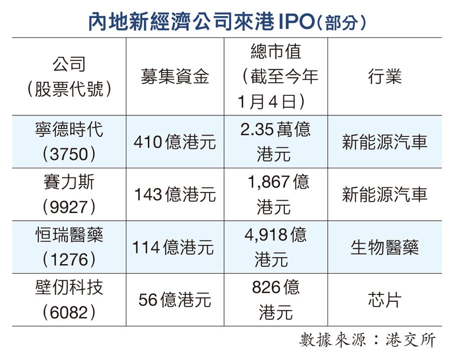 隨着特區政府積極推動金融與創科發展,愈來愈多新經濟企業選擇在港上市。特區政府財政司司長陳茂波昨日發表網誌表示,截至去年底,已有超過400間新經濟公司在港上市,雖然僅佔整體上市公司約一成半數量,但其市值及成交額分別佔大市約三成。今年首個交易日上市的壁仞科技,是香港首批引進的重點企業,被喻為「國產GPU(圖像處理器)四小龍」之一,陳茂波預料今年將有更多前沿科技企業陸續在港上市。