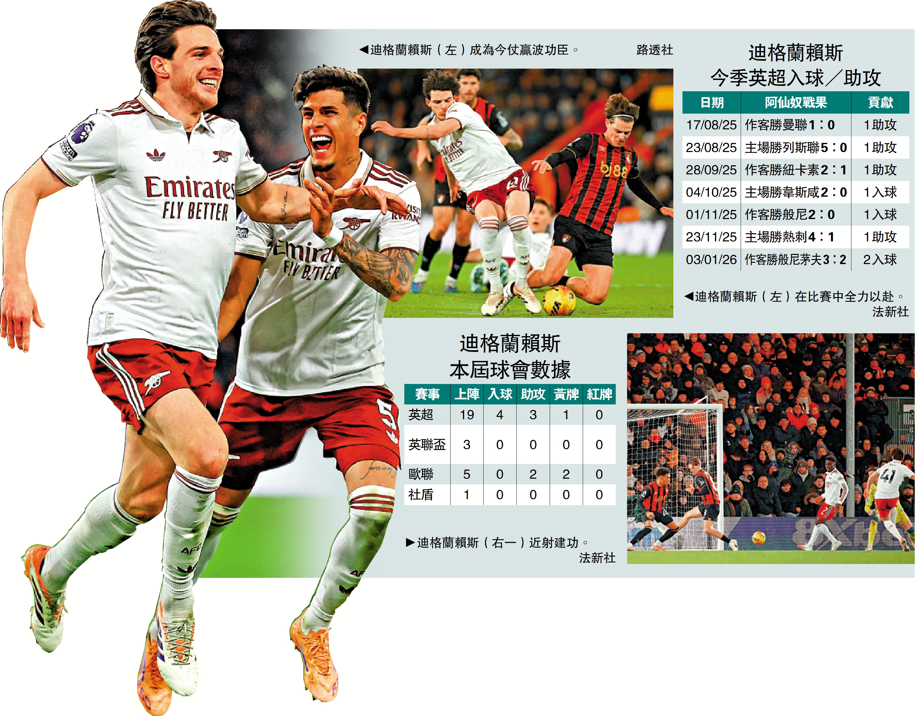 「兵工廠」阿仙奴中場迪格蘭賴斯昨晨「成就解鎖」,上演職業生涯僅第2次、英超的首次「梅開二度」,協助球隊作客反勝般尼茅夫3:2,繼續鞏固榜首地位。賴斯在今季英超暫時取得4入球、4助攻,所有其作出入球貢獻的比賽,阿仙奴也悉數獲勝,當中不乏對勝負極關鍵的入球;主帥阿迪達高度評價這位「全能8號」,若連續第4季衝擊英超錦標的阿仙奴終於如願的話,賴斯可謂球隊通往冠軍之匙。\大公報記者 譚德龍