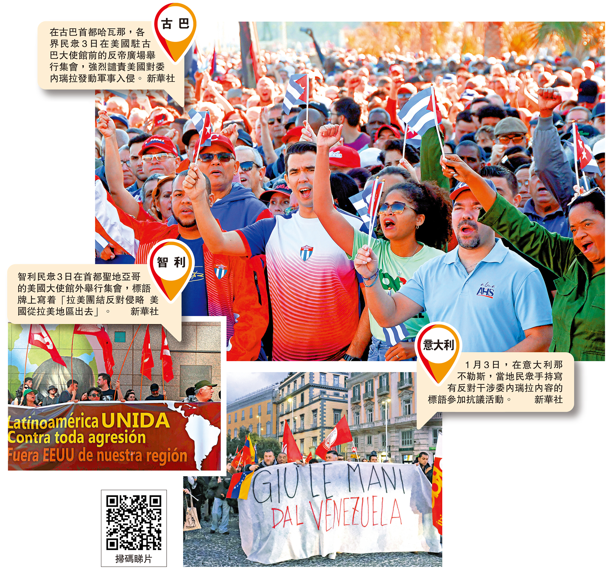 【大公報訊】據新華社報道:全球多國舉行示威活動,抗議美國對委發動襲擊,反對以武力手段顛覆別國政權。巴西外交部3日發布聲明說,巴西總統盧拉重申此前立場,譴責美國襲擊委內瑞拉並抓捕馬杜羅及其妻子的行為。巴西執政黨勞工黨同日發布聲明說,美方行動構成21世紀以來南美洲遭受的最嚴重侵略事件。哥倫比亞外交部3日發表聲明指出,鑒於事態嚴重性及其對平民和地區和平構成的風險,哥方要求聯合國相關機構對局勢進行審議。哥倫比亞總統府辦公廳3日晚宣布,哥方要求5日召開聯合國安全理事會緊急會議,並提議召開美洲國家組織常設理事會特別會議。同時,哥國在哥委邊境部署3萬名士兵,宣布武裝部隊進入一級戰備狀態。