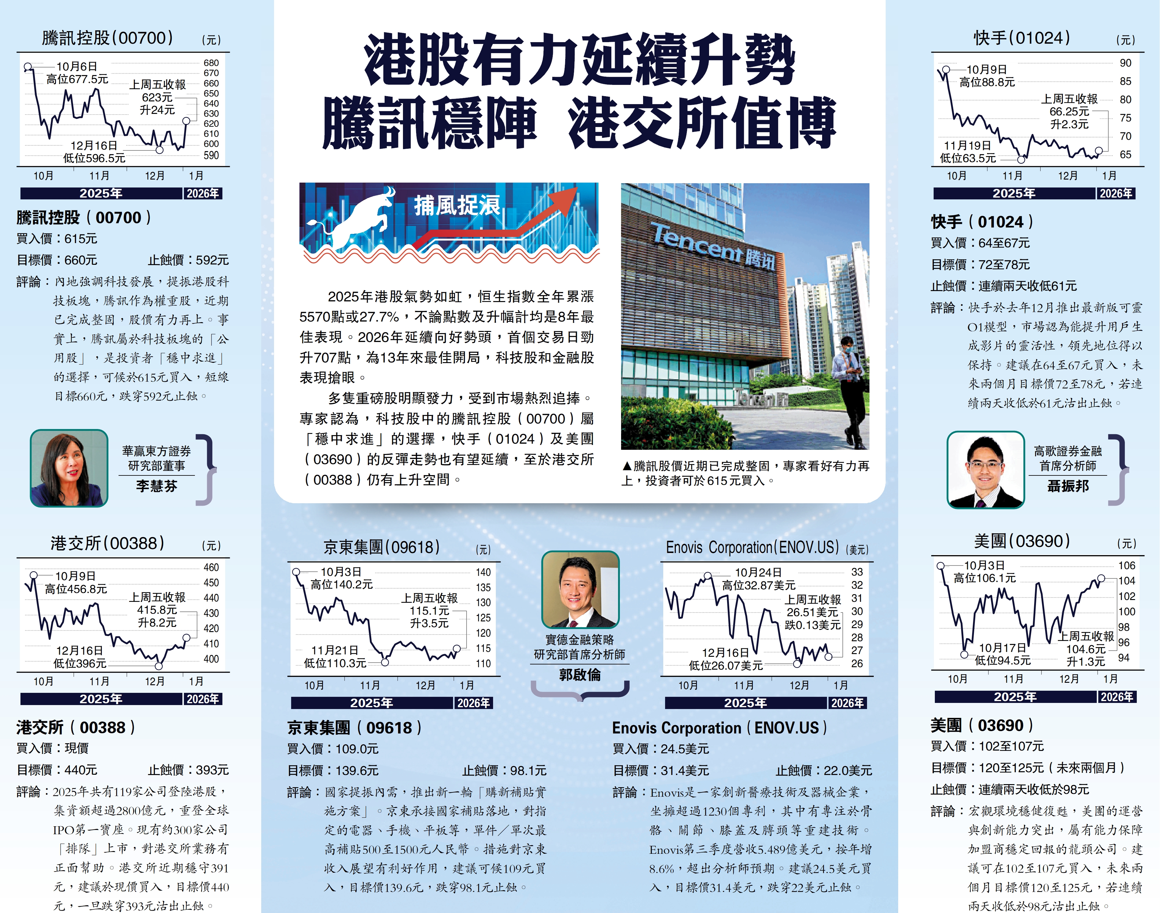 多隻重磅股明顯發力,受到市場熱烈追捧。專家認為,科技股中的騰訊控股(00700)屬「穩中求進」的選擇,快手(01024)及美團(03690)的反彈走勢也有望延續,至於港交所(00388)仍有上升空間。