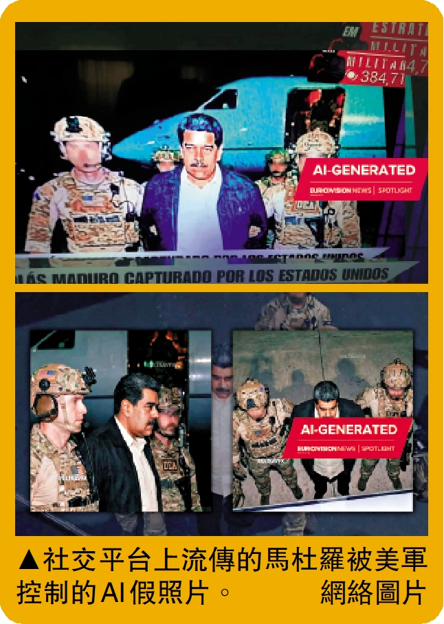 【大公報訊】據美媒Wired報道:美國總統特朗普在當地時間3日凌晨宣布已逮捕委總統馬杜羅及夫人,社交媒體平台上隨後充斥着關於此次行動的虛假信息,包括AI生成的馬杜羅被捕的假圖片和視頻。