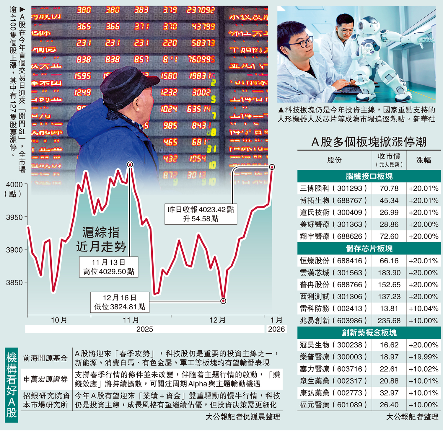 開年首日,A股全市場逾4100隻個股上漲,其中有127隻股票漲停。盤面上,腦機接口、國產芯片、創新藥概念板塊掀漲停潮(見附表);貴金屬、遊戲板塊也有個別股份漲停。商業航天、保險板塊集體走強。其中,中國太保和新華保險股價均錄歷史新高,收市分別升8.87%及7.52%,收報75.88及45.06元。