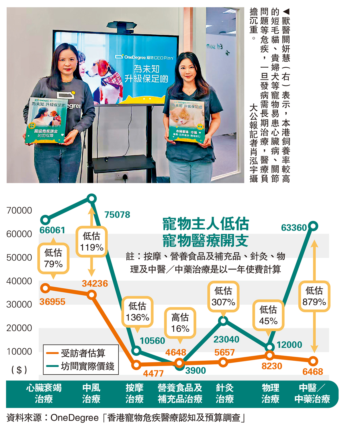 寵主亦普遍嚴重低估危疾醫療費用,例如心臟衰竭及中風的治療費用,受訪寵主估計兩者的治療費用每年約3萬元,而實際費用其實遠高於此。據OneDegree內部理賠數據,心臟衰竭單次急症治療已可高達3萬元,1年持續治療所需花費將更高;另就中風而言,一隻5歲英國短毛貓因中風須接受治療,半年內需要覆診7次,半年治療費用已高逾7.5萬元,對比受訪寵主預計中風1年治療費用為約3.4萬元高出很多。