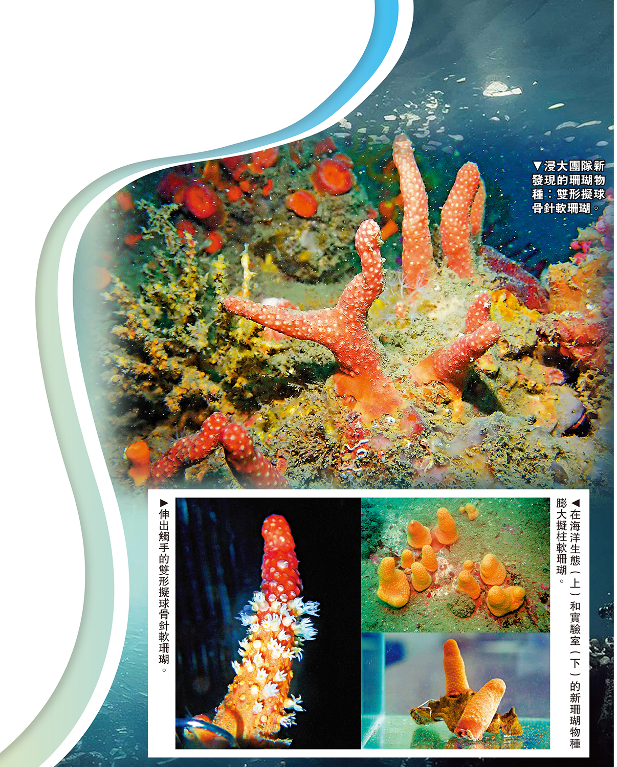 軟珊瑚的分類極具挑戰性,因一些軟珊瑚物種的外觀十分相似,且遺傳基因數據有限,以往中國海域僅記錄了四個屬於「擬柱軟珊瑚屬」的物種。近日,香港浸會大學的海洋生物學家在本港和珠海兩個城市水域發現兩個軟珊瑚新物種。兩個新珊瑚物種分別隸屬「擬球骨針軟珊瑚屬」和「擬柱軟珊瑚屬」,包括「雙形擬球骨針軟珊瑚」及「膨大擬柱軟珊瑚」。是次發現令屬內物種各增至11個,其中雙形擬球骨針軟珊瑚更是首次在中國海域發現同屬物種。\大公報記者 郭如佳