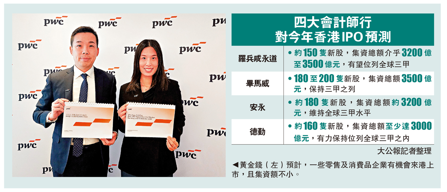 香港新股集資總額去年重奪全球第一之位。展望今年,羅兵咸永道表示,整體利率下降趨勢提升投資者信心,加上特區政府利好政策推動,預料今年將有150家新上市公司,同比增加26.05%,集資總額將達3200億至3500億元,最多增加22.46%,有望繼續位居全球三甲。該所又預計,A股上市仍是新股市場主力,今年將有40隻A+H上市,共集資1400億至1500億元,又估計10家公司以18C形式上市,18A則有20家,兩類公司集資額均約300億元。\大公報記者 李 信