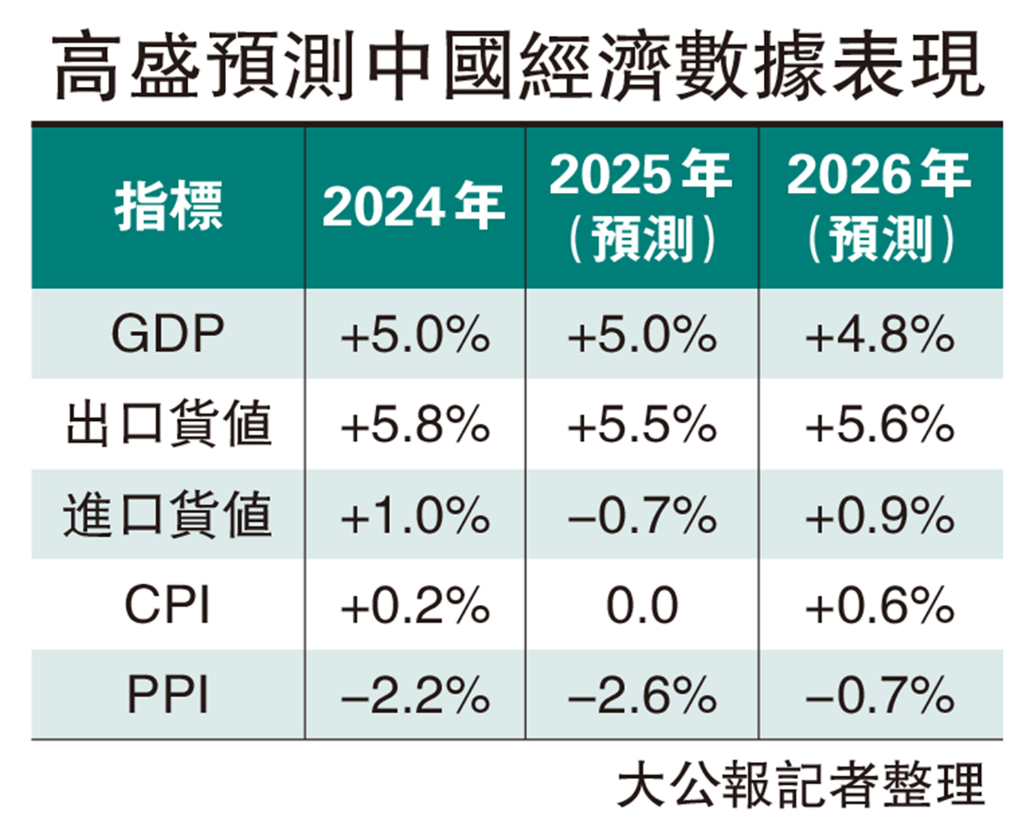 展望中國其他經濟數據的表現,高盛料居民消費價格指數(CPI)將從2025年的0%上升至2026年的0.6%;工業生產者出廠價格指數(PPI)將從跌2.6%轉至跌0.7%;固定資本形成總額增速將從2025年的1.5%,反彈至2026年的3.5%。
