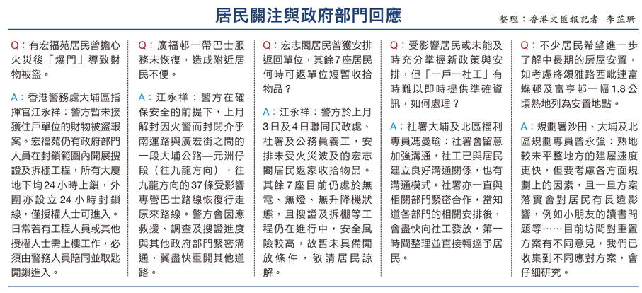 他強調,樓宇管理關乎每位業主與租客的居住安全,即使已有法團的屋苑亦需支援。對於大埔區議會下設大廈管理工作小組,他認為除了宏福苑,區內也有大量舊樓和唐樓的樓宇管理及維修工作需妥善推進,工作小組正可提供協助及意見,協助業主開展相關工作,且兩者可同步進行。