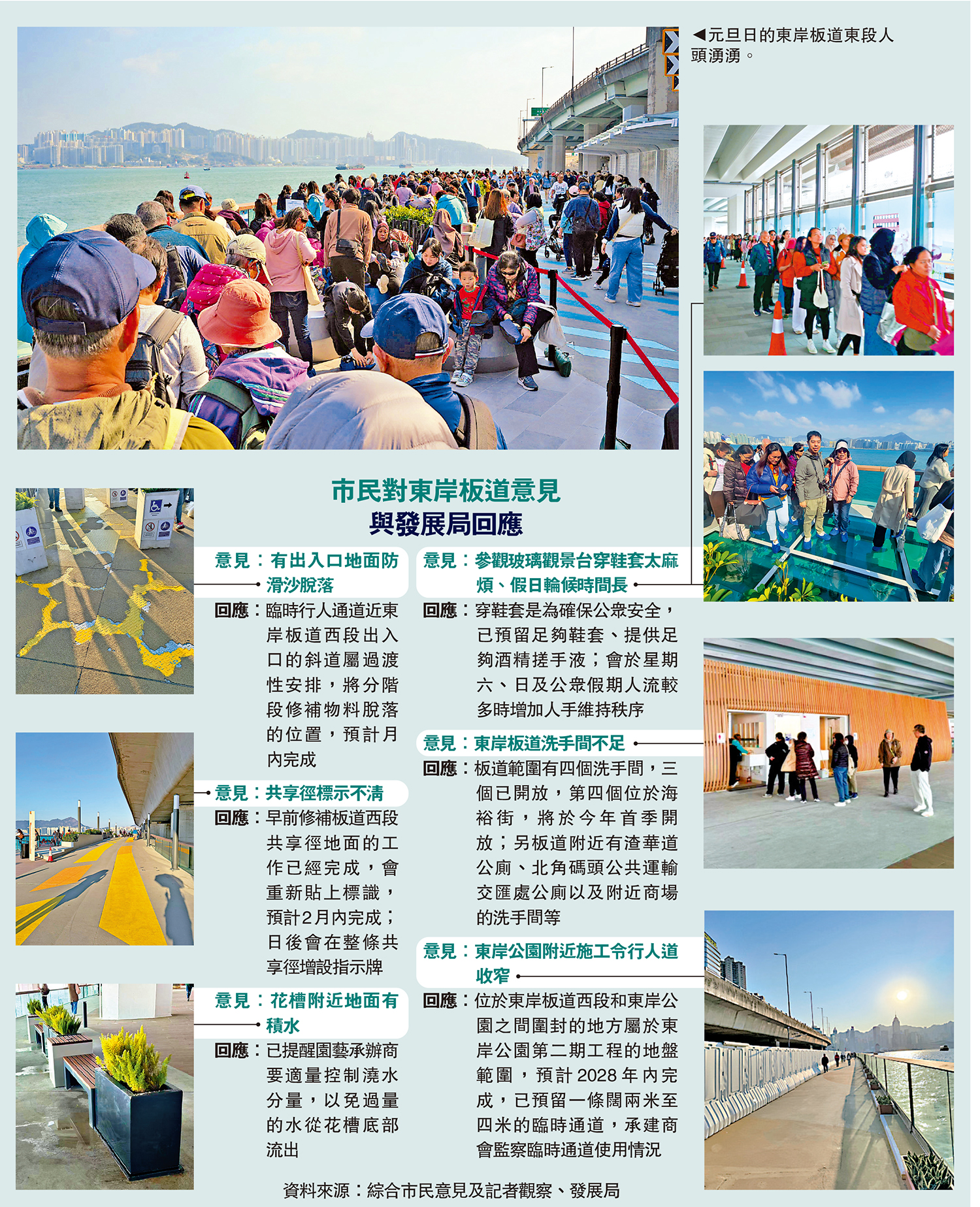 發展局逐一回應市民關注,預告板道範圍內首季將有新洗手間開放,並表示會於繁忙日子增加人手維持玻璃觀景台秩序,並就觀景台開放安排作適當調節。\大公報記者 黃佩琳(文、圖)