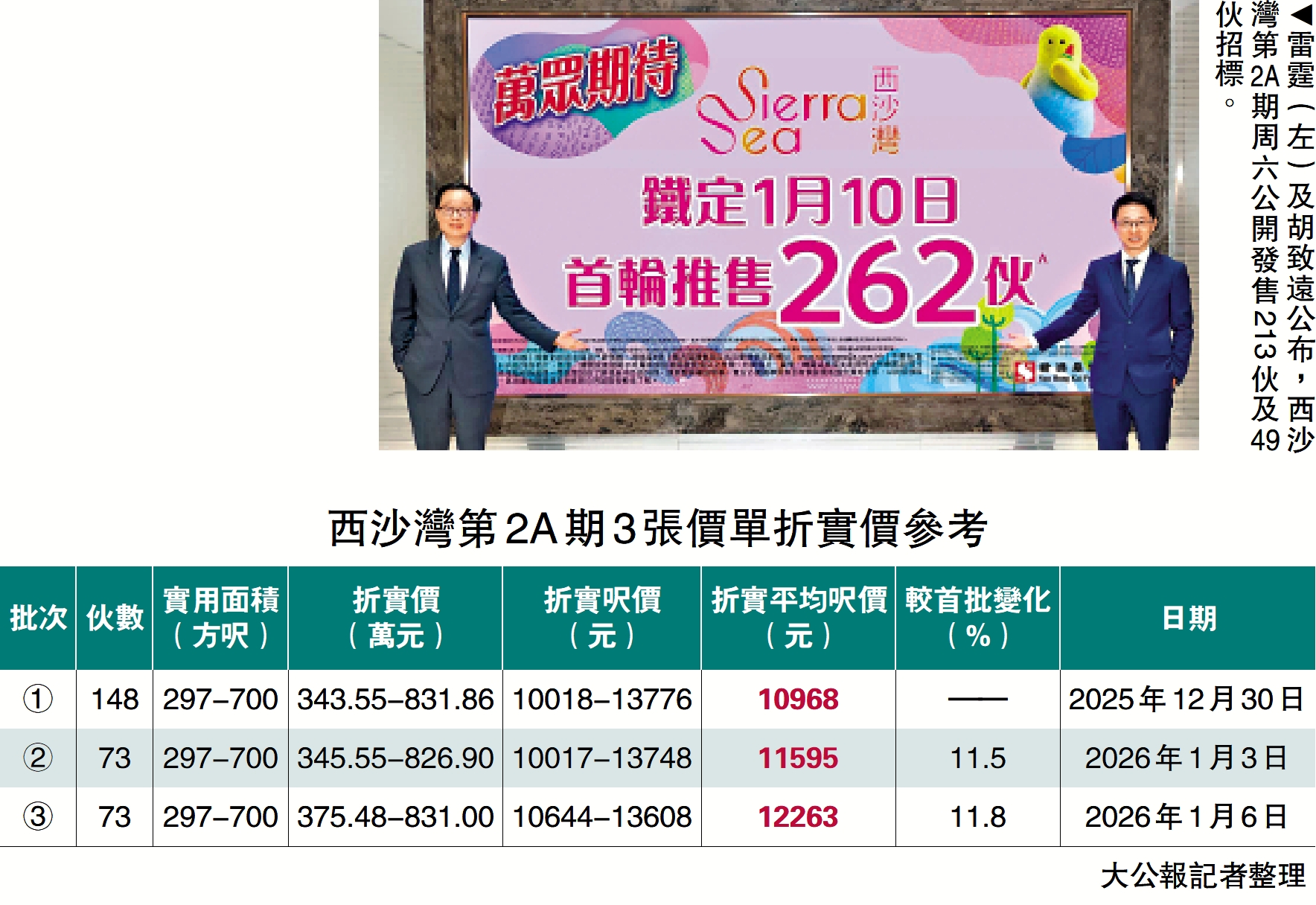2026年新盤第一擊周六開鑼!新鴻基地產(00016)旗下西沙灣(英文稱SIERRA SEA)第2A期氣勢如虹,發展商第二度加推共73伙(3號價單),折實平均呎價12263元,較首批賣貴近12%,撇除景觀及樓層屬原價加推。發展商同步公布銷售安排,落實本周六(10日)首輪推售262伙,包括213伙價單及49伙招標,勢打響今年新盤頭炮。市場消息指出,項目連日收逾2.5萬票,相對周六以價單形式發售的213伙,超額116倍。\大公報記者 梁穎賢