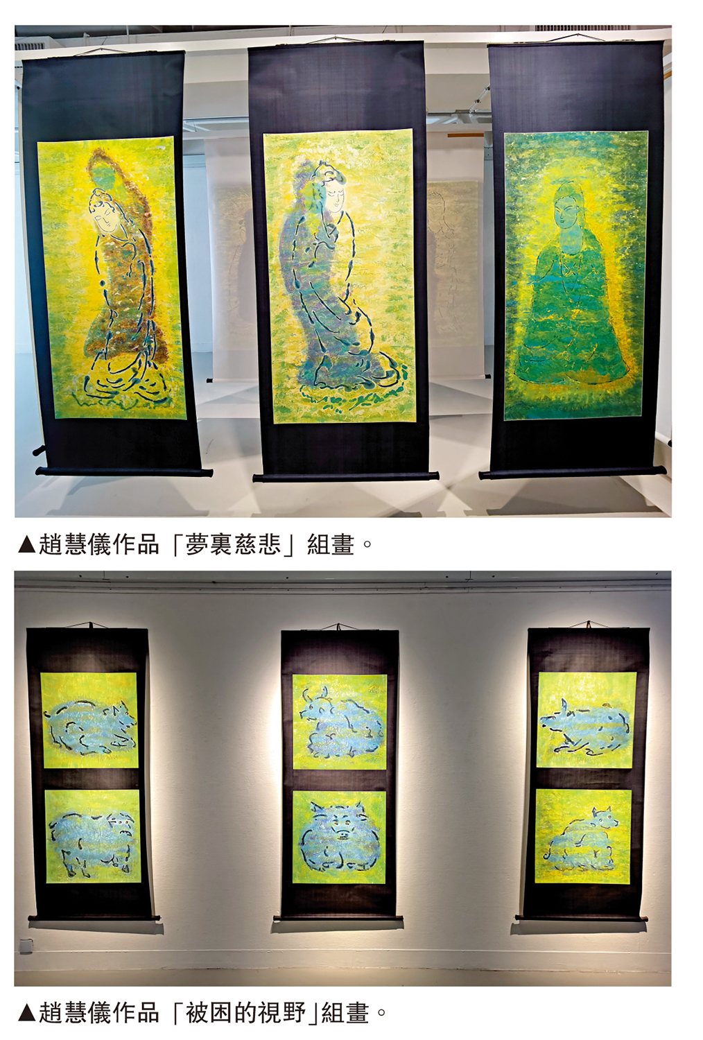 「被困的視野」創作於疫情之下,她觀察到窗外的牛比困在室內的人更自在,因此畫之;「夢裏慈悲」源於一次山西之旅所觀壁畫,遂以光和影描繪菩薩印象,希望能匯成一股可以給予他人希望的力量;「山谷之家」以一件件小碟子畫,勾勒一棵棵植物、蔬菜,抽象卻不失可愛;「流動的天空」由不同的天空畫組成,趙慧儀將它們分割成六條,從高處垂下,詮釋生命的流動。