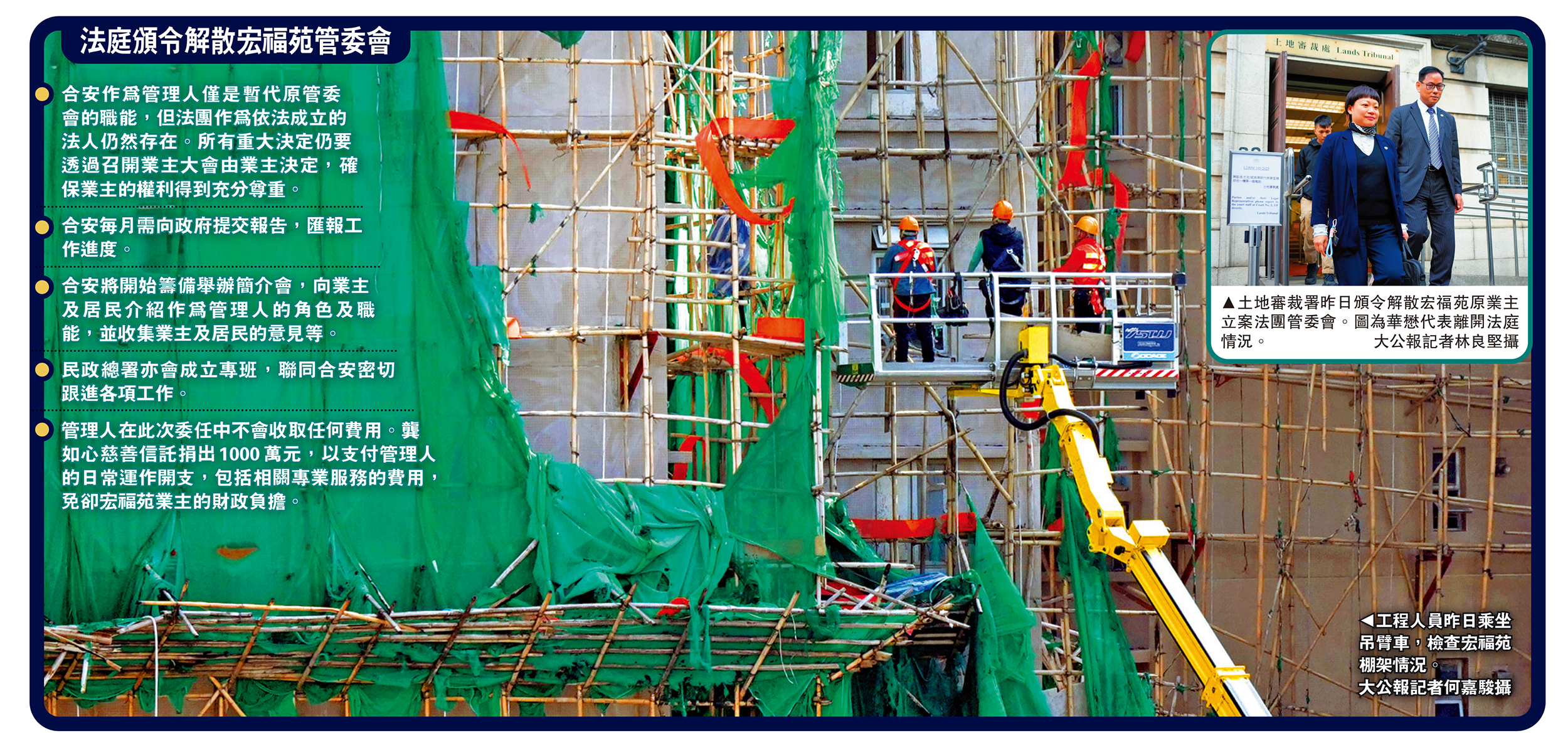 大埔宏福苑大火奪去161人性命,政府首次援引《建築物管理條例》,申請解散宏福苑業主立案法團管委會,委任華懋集團旗下的合安管理有限公司作為屋苑管理人,土地審裁處昨日批准有關申請,頒令「合安」以無償方式擔任管理人,不設限期,每月需向政府提交報告。
