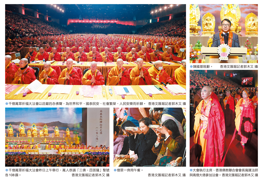 千僧萬眾祈福大法會是「世界和平 國泰民安 千僧萬眾祈福大法會」系列活動的重頭戲,於昨日上午9時30分開始,由大會主席、香港特區政府政務司司長陳國基,以及中央政府駐港聯絡辦副主任劉光源共同主禮。全港善信熱烈響應,場內座無虛席。