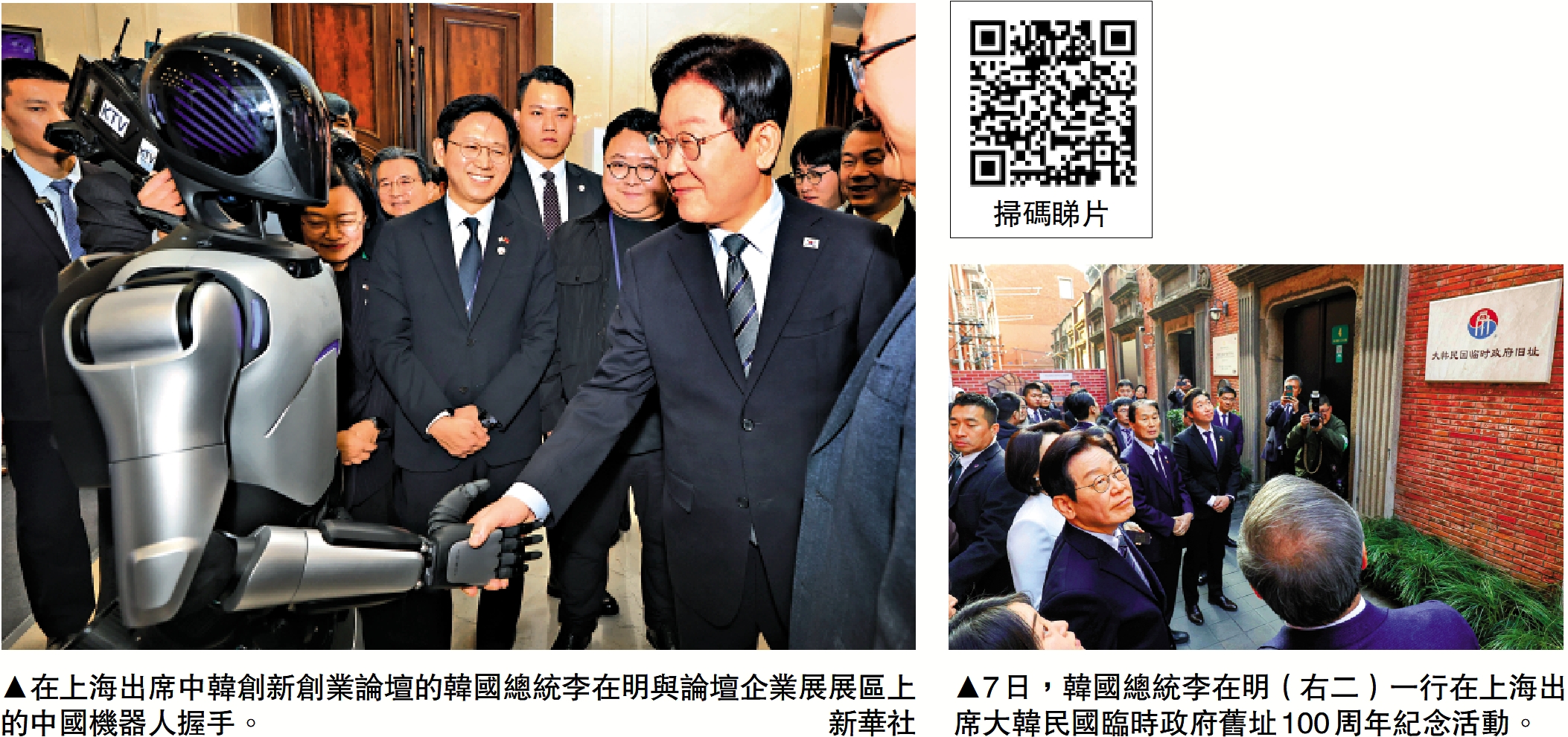 當日上午,李在明在滬出席中韓創新創業論壇。近300名來自中韓兩國智能製造、新材料、人工智能(AI)、醫療健康、文化創意與消費服務等領域的企業代表出席論壇。其間,李在明與中國機器人握手。華東師範大學亞太研究中心主任陳弘表示,「李在明在中韓創新創業論壇的舉動構成非常清晰的政策語言,傳遞出韓中下一階段顯然不再僅僅圍繞傳統製造業、中低端供應鏈進行合作,合作領域會向高附加值、高技術密度的新興產業鏈延伸。換言之,韓國已將未來經濟增長引擎明確瞄準新一代產業合作,而中國正是其最關鍵的合作對象之一。」