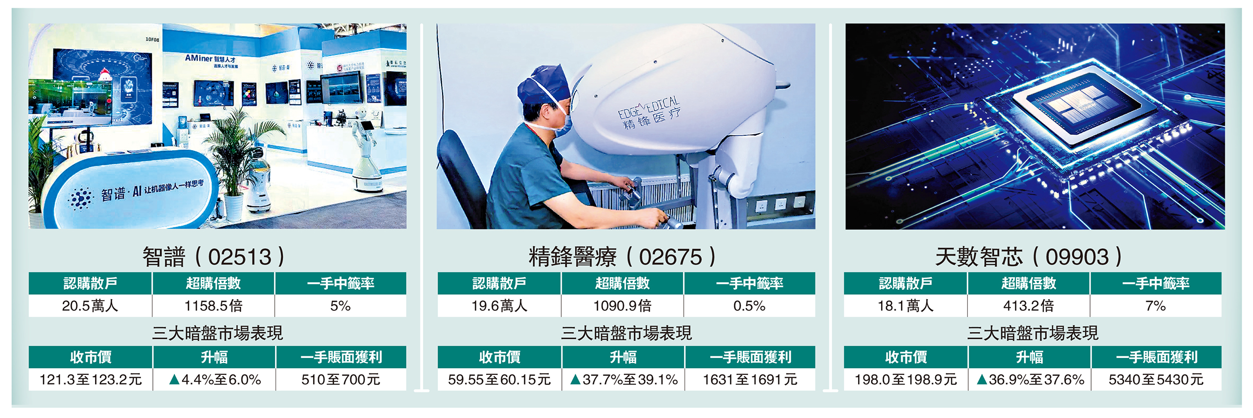 智譜集資43.48億元,20.5萬名散戶參與公開發售,超額認購1158.5倍,其中5.1萬人中籤,一手中籤率5%,認購200手可穩中一手;天數智芯募資36.77億元,獲18.1萬名散戶入飛,超額認購413.2倍,2.2萬人獲分派股份,一手中籤率7%,認購400手穩中一手;精鋒醫療集資12億元,公開發售部分獲19.6萬名散戶入場,超額認購1090.9倍,其中2萬人中籤,一手中籤率0.5%,認購900手可穩中一手。