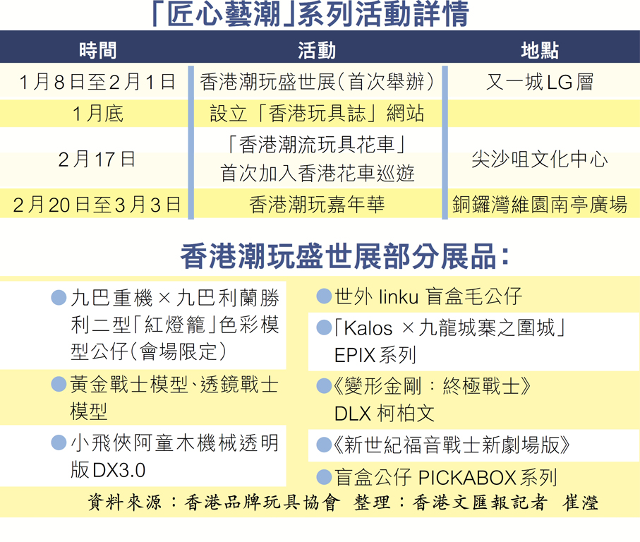 整個潮流盛會一共分為四大階段,包括「香港潮流玩具花車」將參與大年初一的「新春國際匯演之夜」花車巡遊,「香港潮玩嘉年華」則於2月至3月在維園舉行等(見表),期望透過一系列活動,將香港原創潮流玩具及IP與旅遊元素結合,打造獨特文化旅遊體驗。