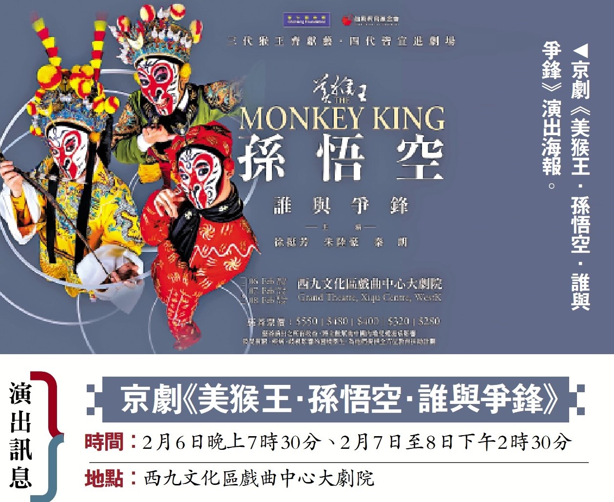 【大公報訊】京劇《美猴王·孫悟空·誰與爭鋒》將於2月6至8日在西九龍戲曲中心大劇院上演,門票現已於西九戲曲中心票務處、Cityline公開發售。該劇近日於戲曲中心舉行新聞發布會,三代猴王同台亮相,大鬧西九,掀起全場高潮。
