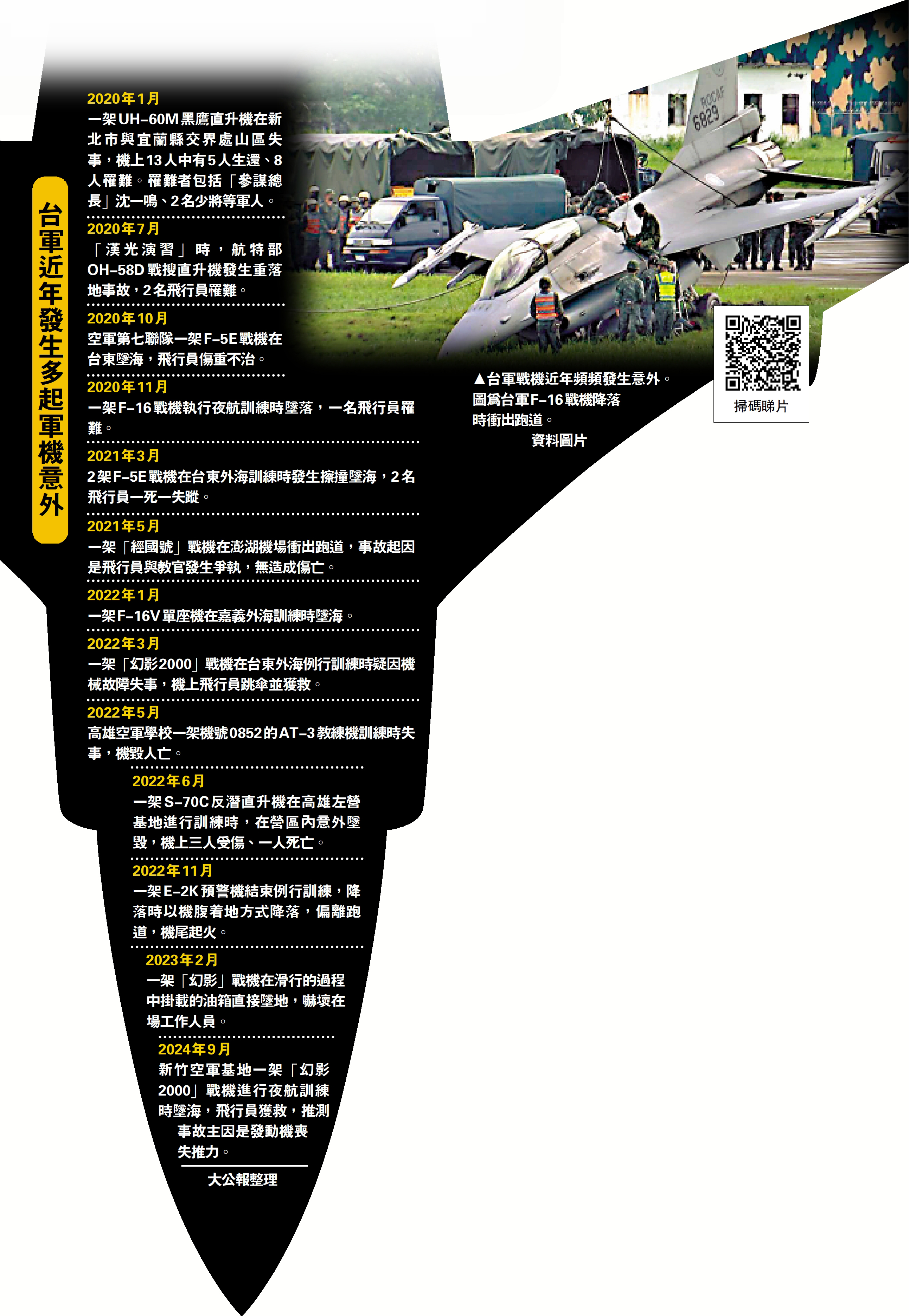 台軍一架F-16V戰機6日晚失事墜海。這是台軍提升F-16戰機性能後,失事的第二架戰機。近年台戰機頻頻發生意外,台軍戰機被揭露多項裝備問題。國民黨籍民意代表馬文君痛批,飛行員當時駕駛的F-16V戰機,模組化任務電腦故障,未具備自動地面防撞系統,甚至連基本的防寒飛行衣都未配發,允諾要在2023年完成自動地面防撞系統也沒做到,台防務部門甚至承認連到貨都沒有,「令官兵情何以堪」。台灣輿論批評民進黨當局編列龐大的防務預算,但台軍裝備仍存在巨大漏洞,根本就是罔顧軍人性命。