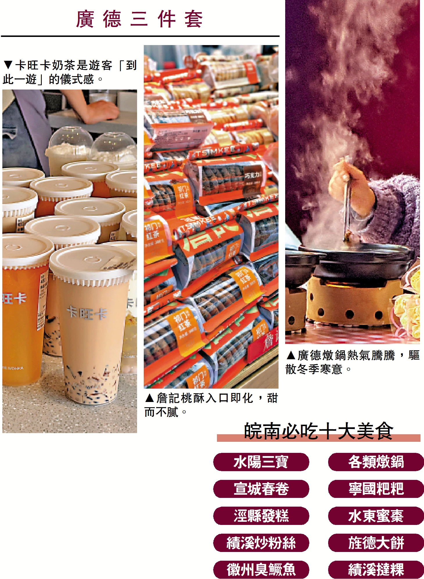 這個冬天,安徽宣城的廣德市,意外成了內地旅遊版圖上的一匹「黑馬」。廣德的走紅,源於網友口中的「廣德三件套」── 一杯卡旺卡奶茶、一塊詹記桃酥和一口熱氣騰騰的廣德燉鍋。看似尋常的吃喝組合,卻在短視頻平台與社交媒體的推波助瀾下,迅速點燃了無數人的出遊熱情。從「這是哪兒」到「什麼時候去」,不少外省遊客完成了一次心態轉變,也親身見證了新型消費政策背景下,一座小城被重新看見的過程。\潘 少(文、圖)